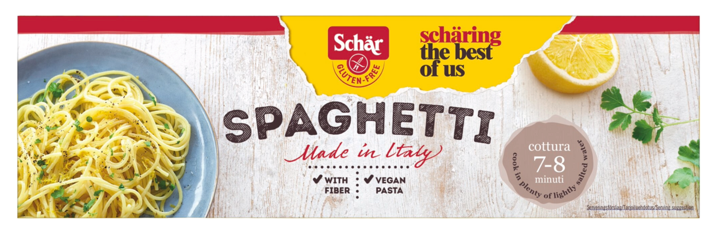Schär Spaghetti on aito italialainen pasta ja klassikko lautasella. Nauti tuoreen tomaattikastikkeen, peston tai carbonaran kanssa. Yksinkertainen ainesosaluettelo, ei sisällä gluteenia, vehnää, laktoosia, maitoa, kananmunaa, palmuöljyä tai säilöntäaineita.