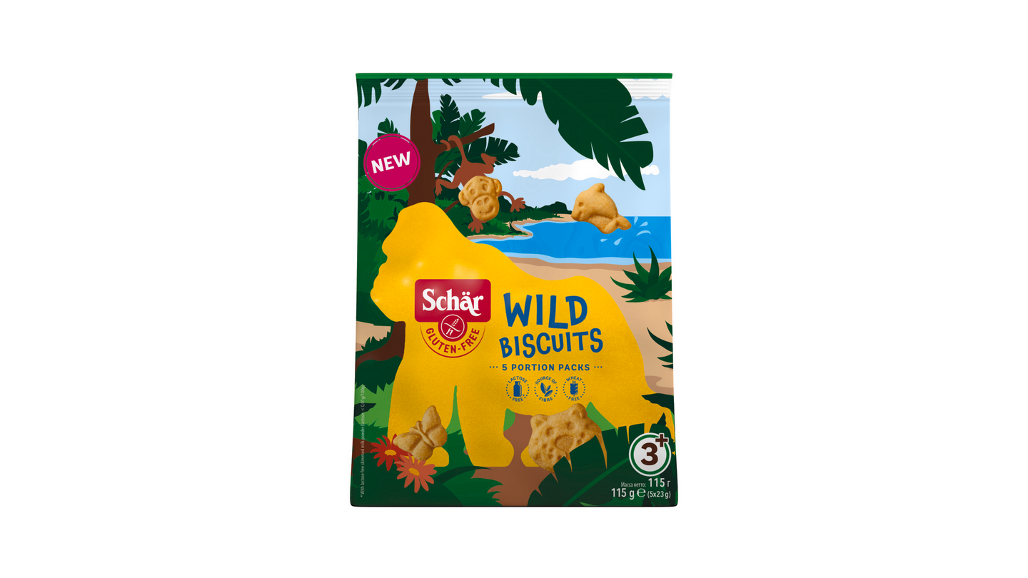 LaktoositonHauskanpitoa jokaisessa eläimenmuotoisessa suupalassa. Wild biscuits -keksi on herkullinen eläimen muotoinen keksi, jossa on mieto vaniljan maku. Kätevästi annospakattu pieniin pusseihin. Tee välipalasta seikkailu Wild Biscuit -kekseillä, joissa hauskat ja jännittävät eläinmuodot kohtaavat herkullisen maun. Keksit ovat laktoosittomia, gluteenittomia ja vehnättömiä.