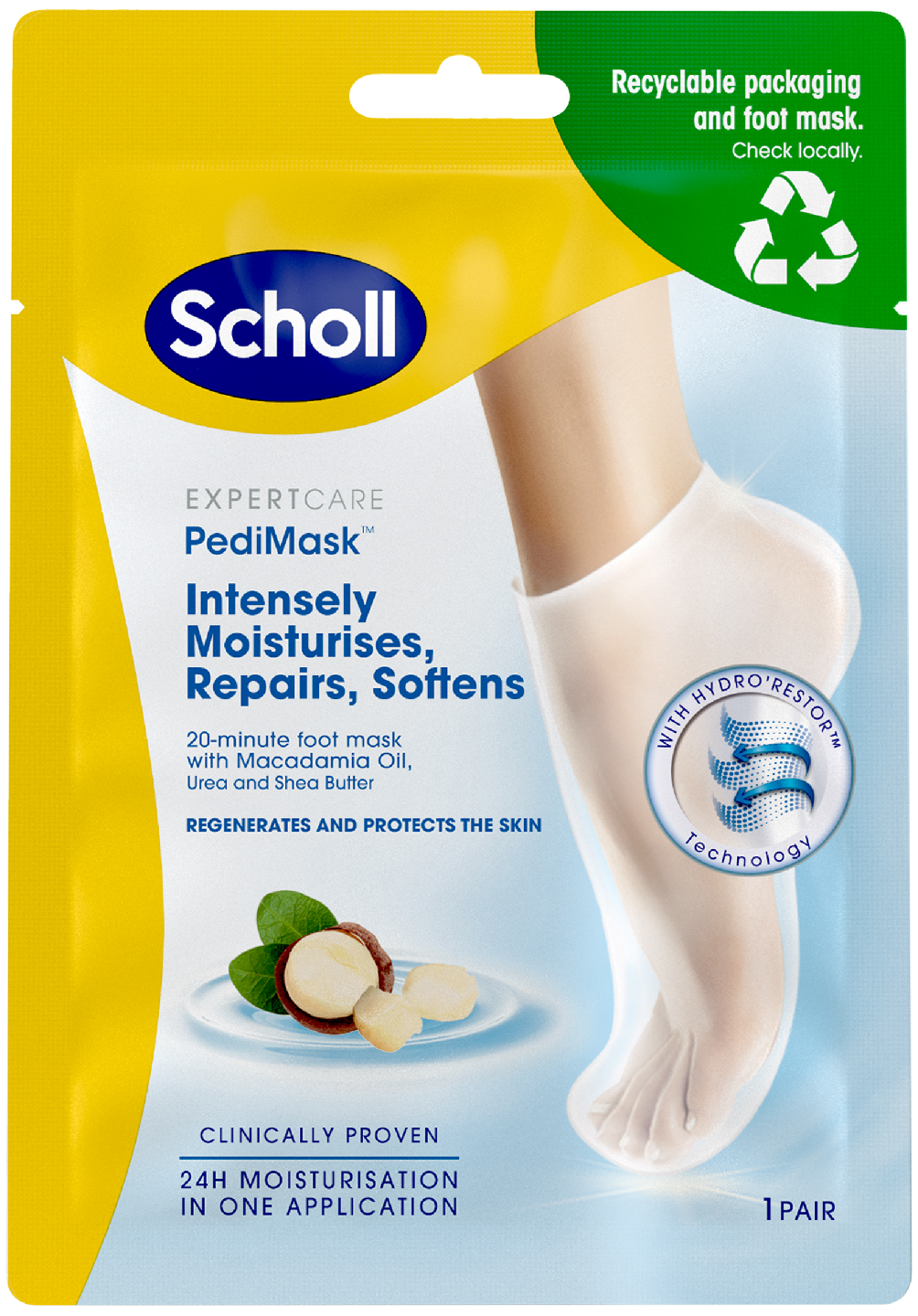 Schollin Kosteuttava ExpertCare PediMask™ -jalkanaamio on asiantuntijoiden kehittämä jalkanaamio, joka on suunniteltu erityisesti jalkojen kuivalle iholle.