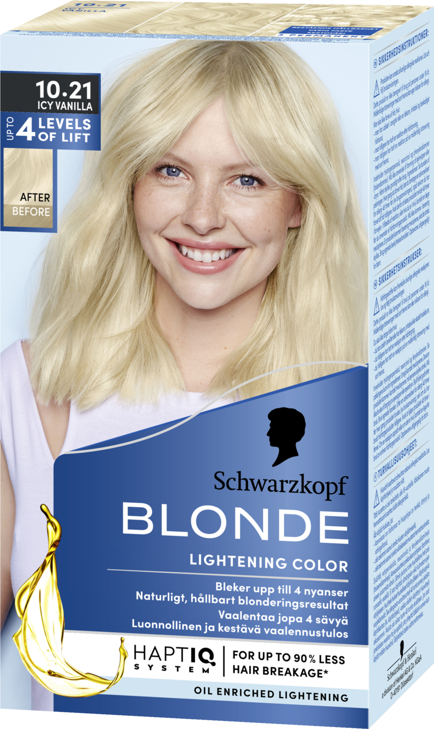 Schwarzkopf 10.21 Icy Vanilla – vaalentava hiusväri kirkastaa hiuksia jopa 4 astetta ja luo viileän huurteisen sävyn hiuksiin.