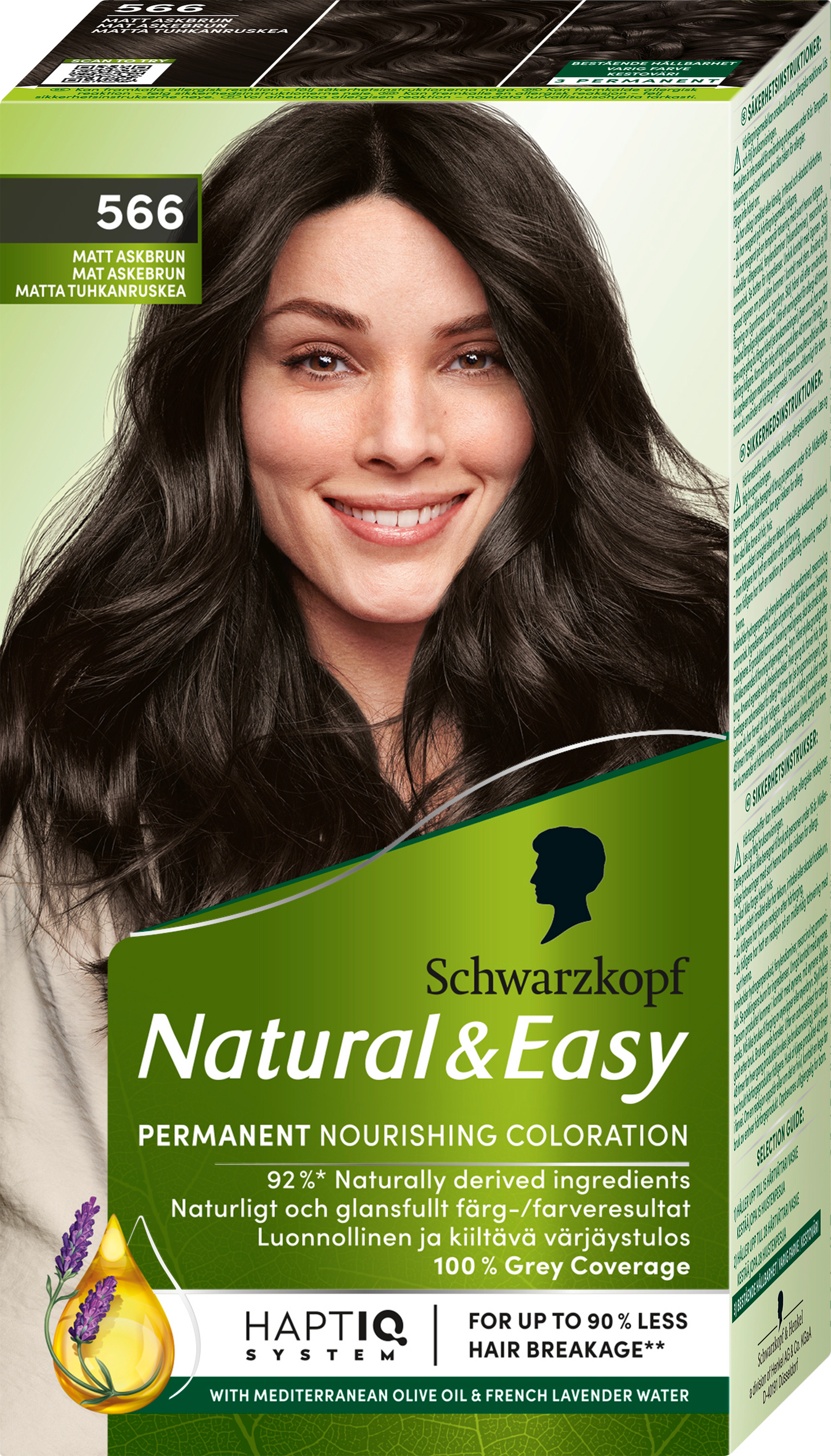Schwarzkopf Natural & Easy on luonnollisen kaunis hiusväri. Kolme yhteensopivaa väri sekoitettuna keskenään tekevät lopputuloksesta kauniin vivahteikkaan ja luonnollisen elinvoimaisen. Värjäyksen jälkeen käytettävä hoitoaine sisältää ravitsevaa Välimerellistä oliiviöljyä, joka syväkosteuttaa hiuksia. Säihkyvä lopputulos syntyy turvallisesti ilman vaurioita HAPTIQ-teknologialla! Jopa 93 % raaka-aineista on luonnollista alkuperää.