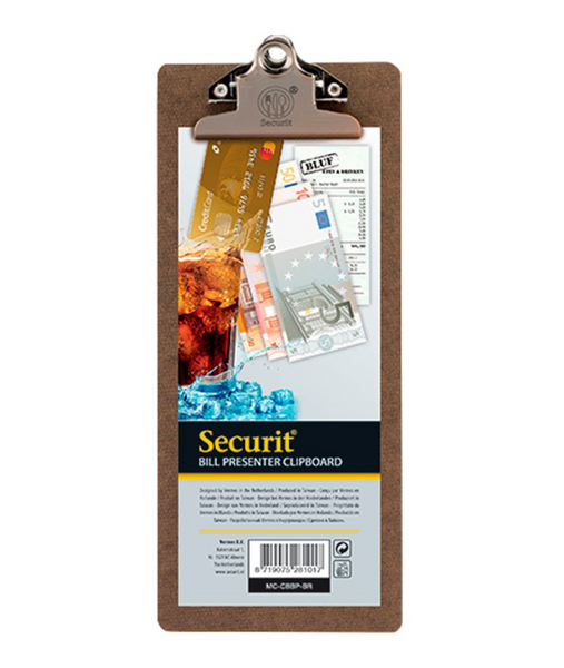 Kovapuusta valmistettu ruskea Laskukansio ravintolan ym laskuille, metallinen puristin