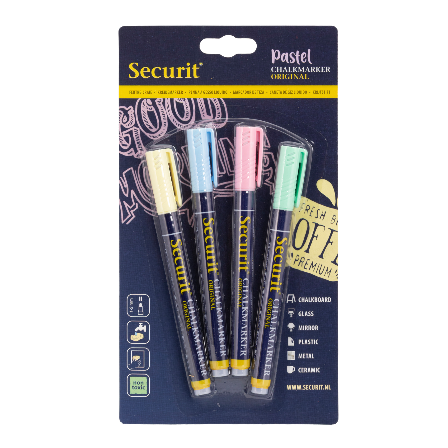 Securit Liitutussit 4 pastellivärin pakkaus. Securitin laadukkaat liitutussit kauniissa pastellisävyissä. Tussien kärki 1-2mm. Ravintoloille, kahviloille yms liitutauluihin kirjoittamiseen. Sopii myös lasille, muoville, metallille, keramiikalle. Voi pyyhkiä pois kostealla liinalla. Blisterpakkaus.