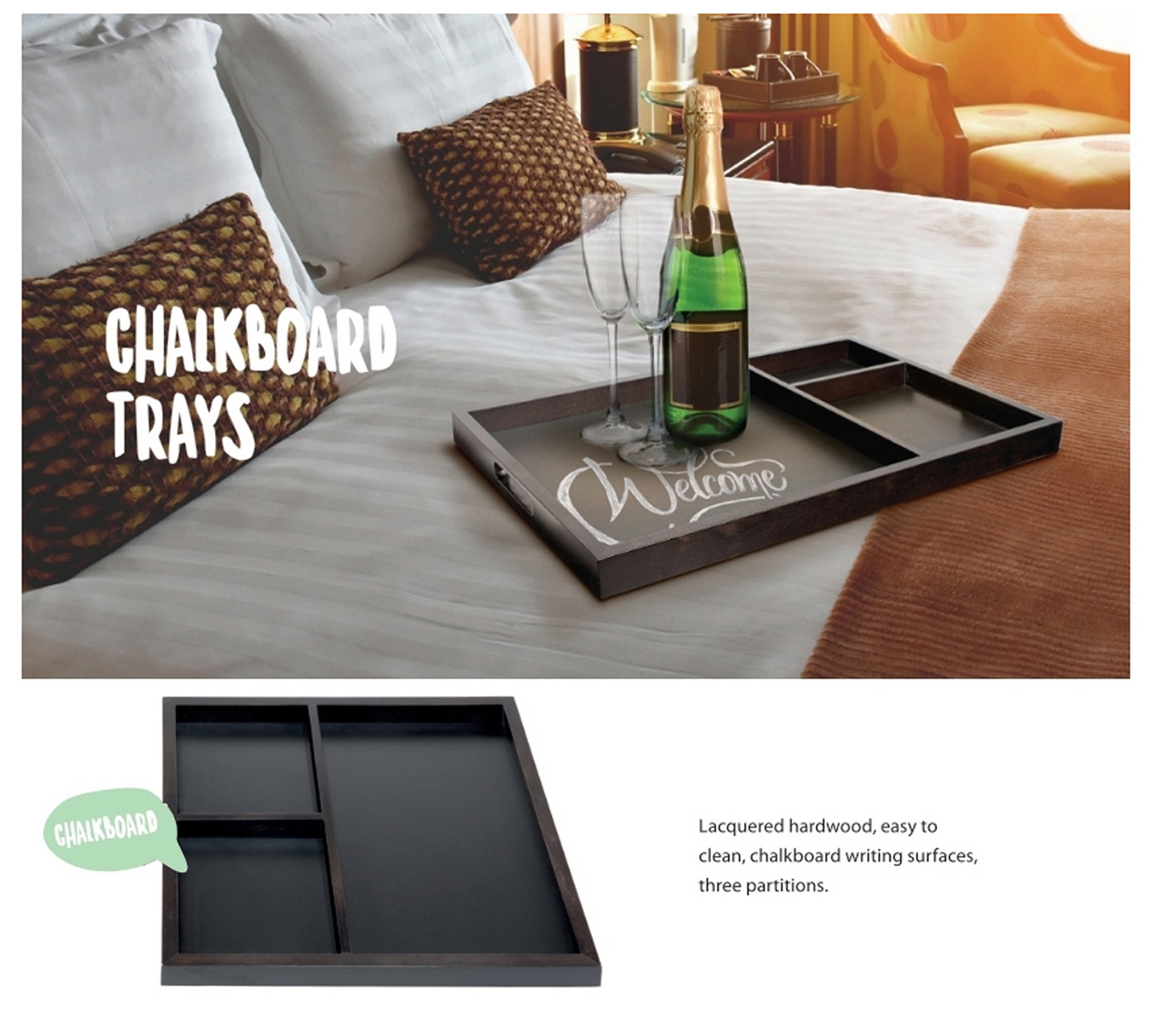 Puutarjotin liitutaulupinnalla 40x40cm, 3 cm korkeat reunat. Tarjotin tummaa puuta, pohja mustaa liitutaulupintaa, johon voi kirjoittaa liidulla tai liitutaulutussilla.