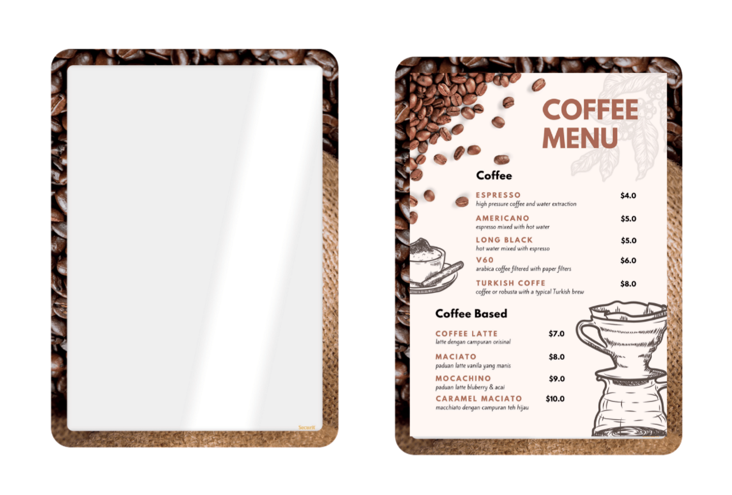 Securit Tarratasku A4 Kahvi. Taustassa tarrapinta, päällä kahvi-kehykset magneettireunoilla. Voi kiinnittää seinälle, lasiin ym