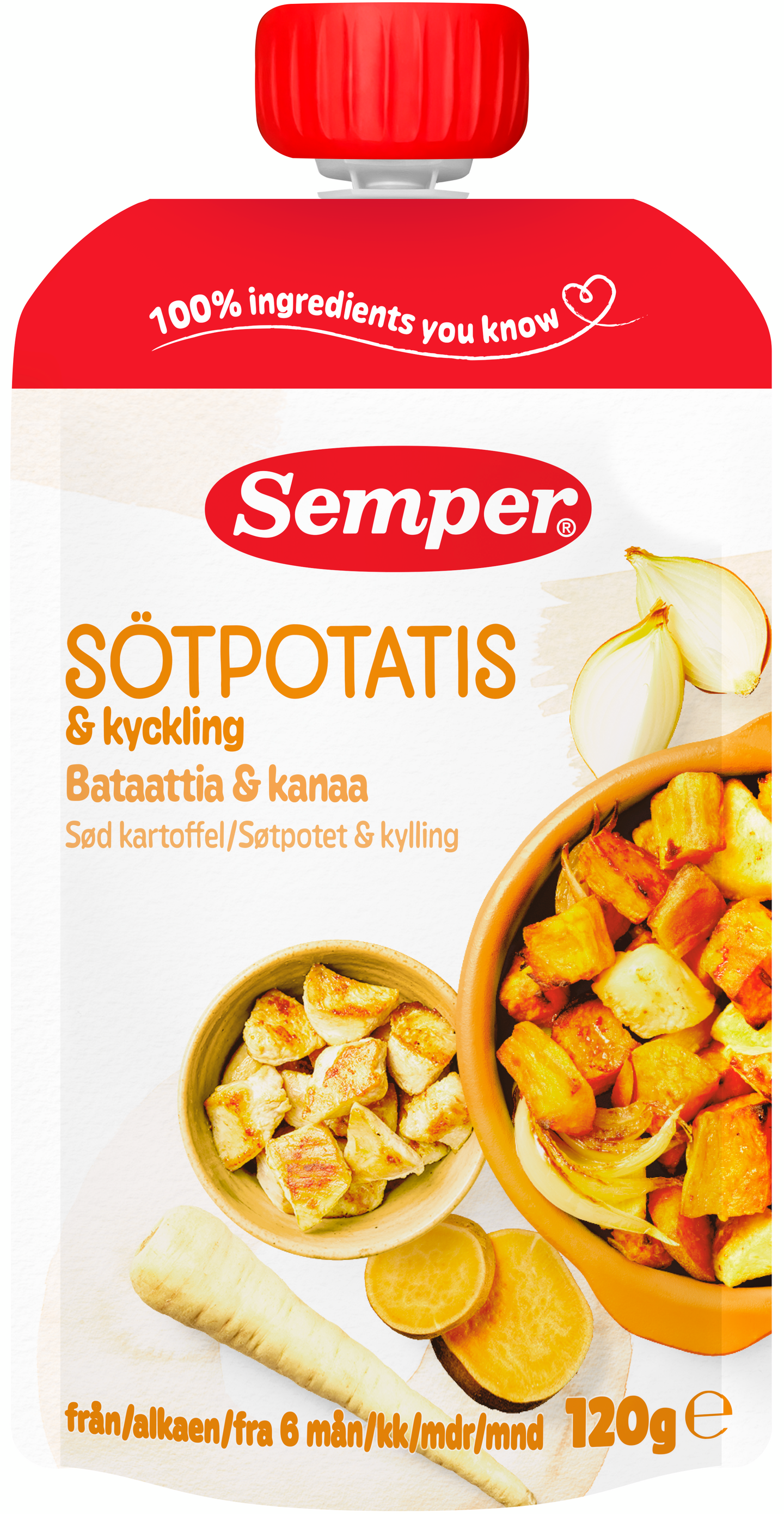 Semper Bataattia & kanaa annospussissa sopii lapsille 6 kk iästä alkaen. Se on täydellinen ateria, kun vauvasi on valmis aloittamaan tutustumisen kiinteisiin ruokiin. Bataattia & kanaa on huolella valmistettu ja ravitsemuksellisesti tasapainoinen ruoka, joka on valmistettu parhaista saatavilla olevista aineksista. Sisältää vain ainesosia, jotka tunnistat omasta keittiöstäsi. Valitessasi Semperin tuotteen voit luottaa siihen, että saat aina huolellisesti valituista, korkealaatuisista aineksista valmistettua lastenruokaa. Resepti noudattaa sekä WHO:n ravitsemussuosituksia että Pohjoismaisia ravitsemussuosituksia 6 kuukauden ikäisille lapsille.