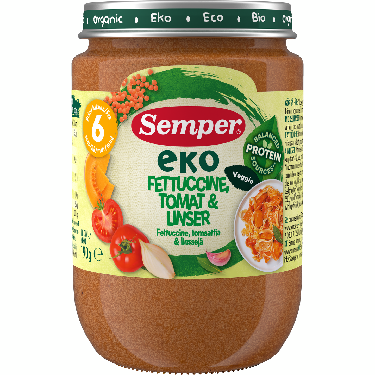 Semper Luomu Fettucinea, tomaattia ja linssejä on terveellinen ja herkullinen pienten lasten vegaaninen ateria. Maidoton ateria sopii lapsille noin 6 kuukauden iästä alkaen. Sisältää sopivia pieniä paloja lapselle, joka opettelee pureskelemaan ruokaansa. Kuuden kuukauden ikäisille tarkoitettuja aterioita on hieman maustettu. Kun lapsi tottuu miedosti maustettuihin aterioihin, hänen on helpompi siirtyä noin vuoden ikäisenä syömään samaa ruokaa muun perheen kanssa. Kaikki Semper lastenruoka-ateriat on valmistettu ilman lisättyä suolaa, sokeria tai säilöntäaineita.
