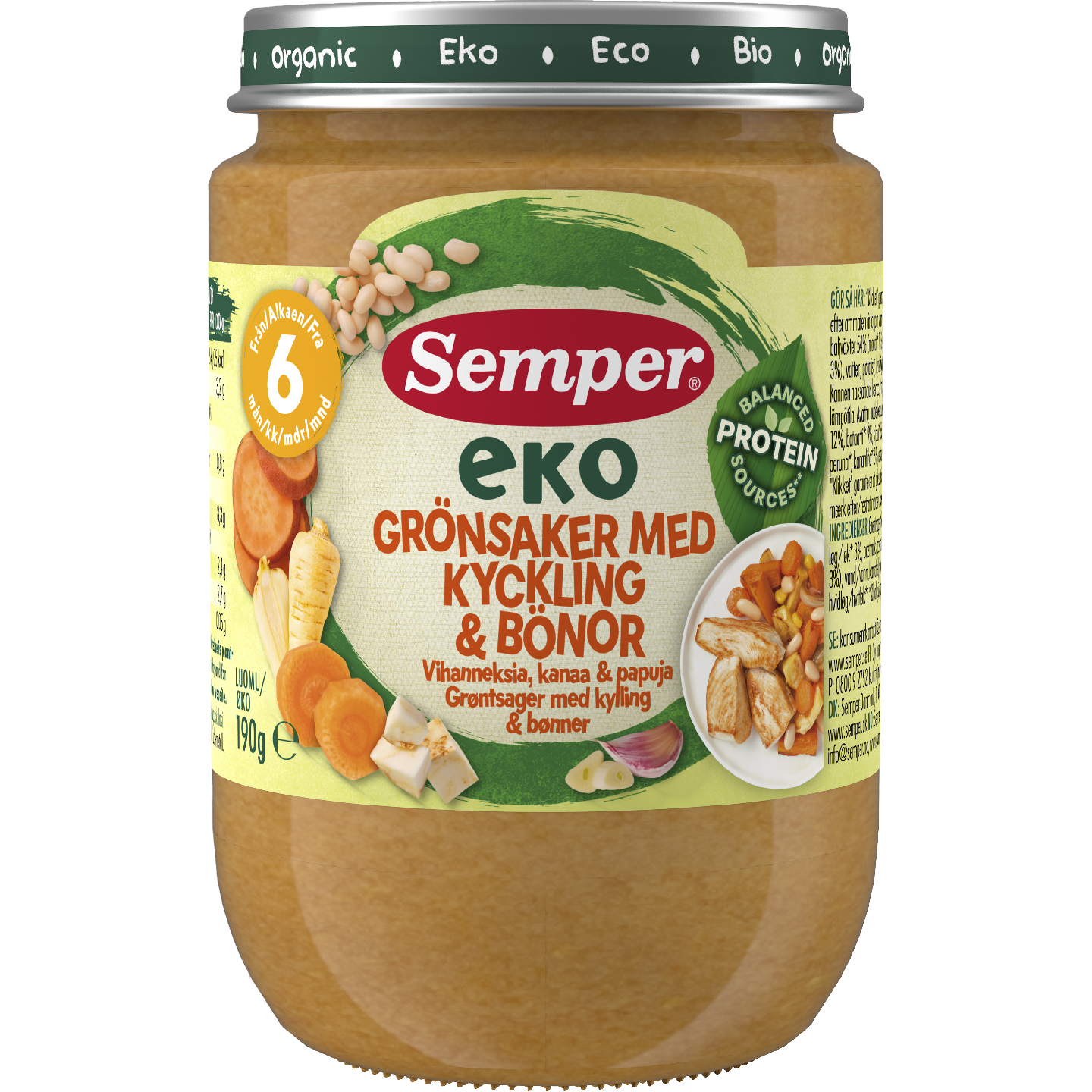 Semper Luomu Vihanneksia, kanaa ja papuja on terveellinen ja herkullinen pienten lasten ruoka. Ateria sopii lapsille noin 6 kuukauden iästä alkaen. Kaikki Semper lastenruoka on valmistettu ilman lisättyä suolaa, sokeria tai säilöntäaineita.
