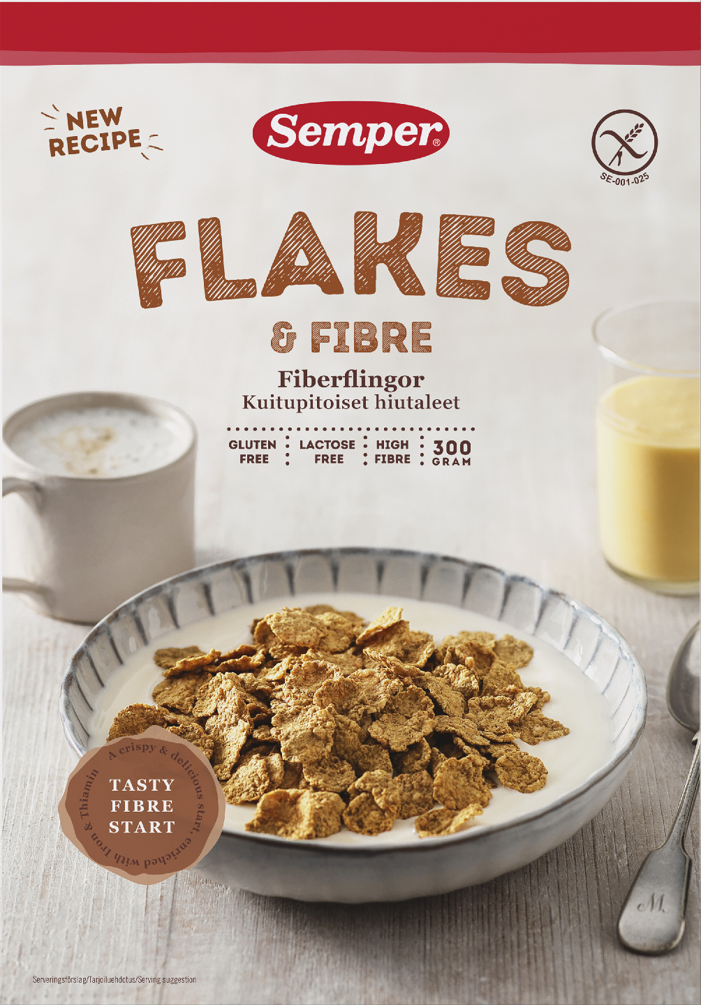 LaktoositonFlakes & Fibre -hiutaleet ovat Semperin gluteenittomia ja runsaskuituisia aamiaishiutaleita. Nauti hiutaleet maidon tai jogurtin kera.