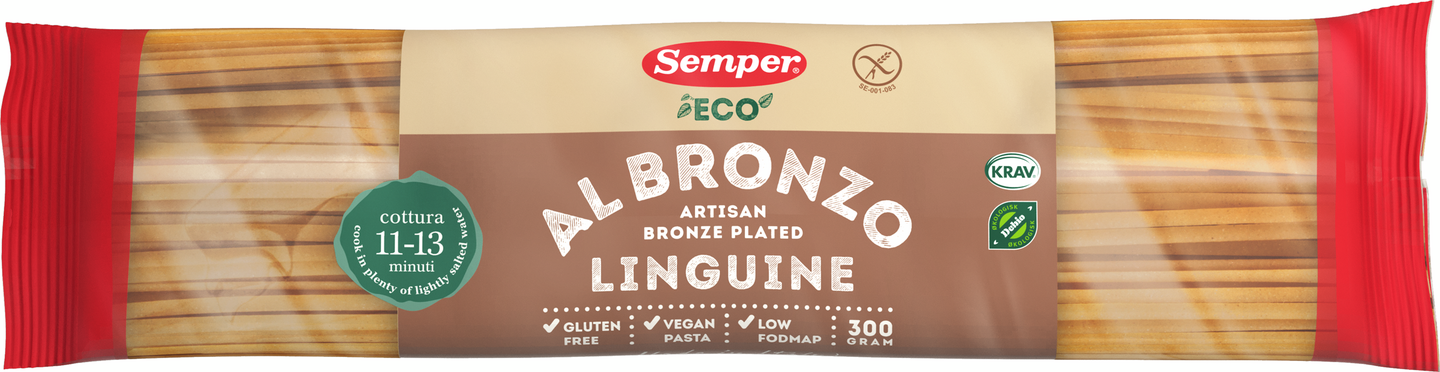 VegaaninenSemperin Linguine pasta on gluteenitonta luomu pastaa, joka valmistetaan al bronzo -menetelmällä pronssivalssien avulla. Menetelmän ansioista pastan pinta on karkea ja se sitoo kastikkeen maun erityisen hyvin. Pasta Linguine on KRAV-merkitty, FODMAP-ystävällinen ja vegaaninen.