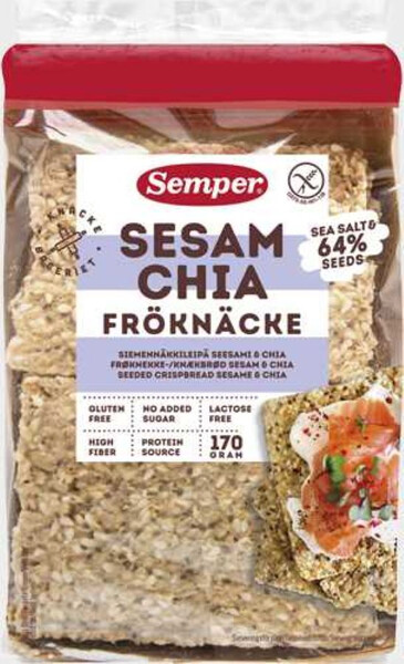 LaktoositonSemperin siemennäkkileipä Sesam & Chia on gluteeniton ja runsaskuituinen näkkileipä. Rapea, vegaaninen näkkileipä, jossa on runsaasti siemeniä (64%), sopii kaikkiin tilanteisiin!