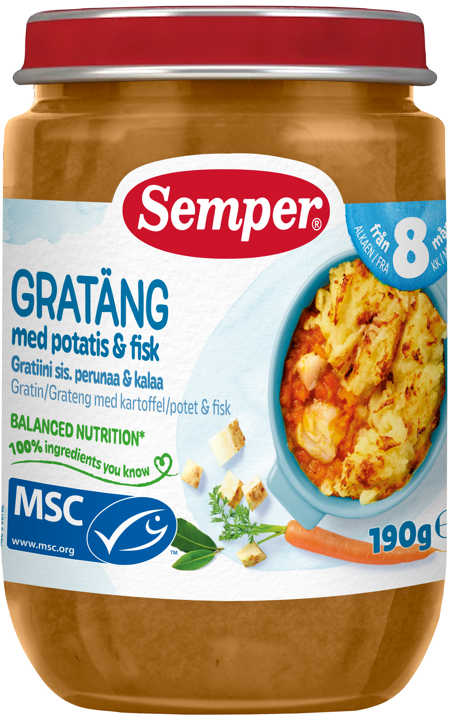 Semper Gratiini sis. perunaa & kalaa on herkullinen pienten lasten ruoka. Maidoton ateria sopii lapsille noin 8 kuukauden iästä alkaen. Sisältää sopivia pieniä paloja lapselle, joka opettelee pureskelemaan ruokaansa. Kahdeksan kuukauden ikäisille tarkoitettuja aterioita on myös maustettu hieman monipuolisemmin verrattuna 6 kuukauden ikäisten aterioihin. Kun lapsi tottuu miedosti maustettuihin aterioihin, hänen on helpompi siirtyä noin vuoden ikäisenä syömään samaa ruokaa muun perheen kanssa. Kaikki Semper lastenruoka on valmistettu ilman lisättyä suolaa, sokeria tai säilöntäaineita.