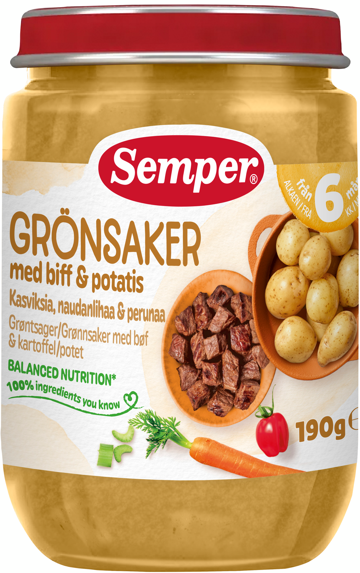 Semper Kasviksia,naudanlihaa ja perunaa ateria lasipurkissa sopii yli 6 kuukauden ikäisille lapsille. Täydellinen koostumus, kun vauvasi on valmis aloittamaan kiinteät ruuat. Kasviksia ja naudanlihaa ateria on maukas, huolella valmistettu ja ravitsemuksellisesti lapsen tarpeisiin suunniteltu ateria, jonka koostumus sopii lapsen ikään. Semperin tuotteita voit syödä hyvillä mielin. Voit olla varma, että saat aina vauvanruokaa, jossa on huolella valitut, korkealaatuiset raaka-aineet.