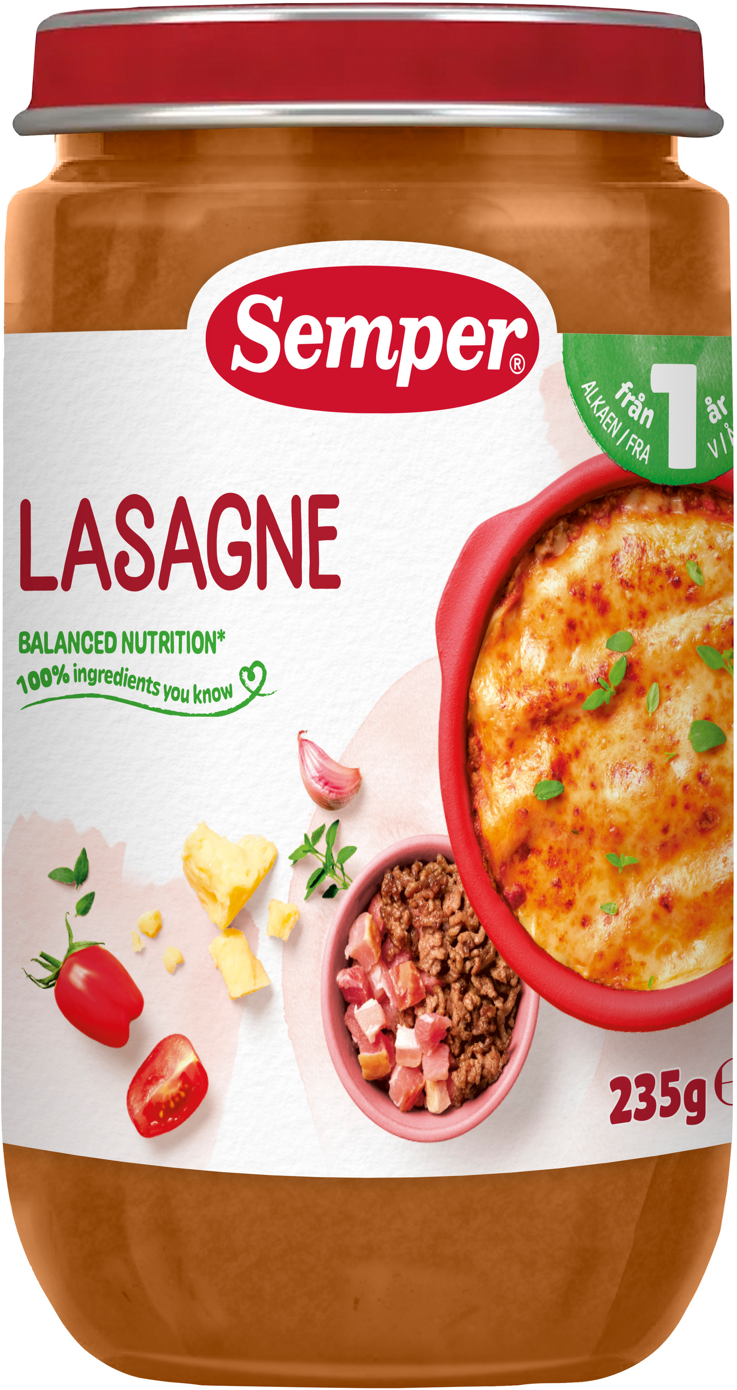 Semper Lasagne on terveellinen ja herkullinen pienten lasten ateria. Sisältää 50% kasviksia, kuten tomaattia, porkkanaa ja sipulia. Ateria sopii lapsille noin yhden vuoden iästä alkaen. Vaikka yksivuotias syökin mielellään tavallista kotiruokaa, taaperoille tarkoitetut Semper-ateriat ovat helppoja ja monipuolisia vaihtoehtoja kotiruoalle. Kaikki Semper lastenruoka on valmistettu ilman lisättyä suolaa, sokeria tai säilöntäaineita.