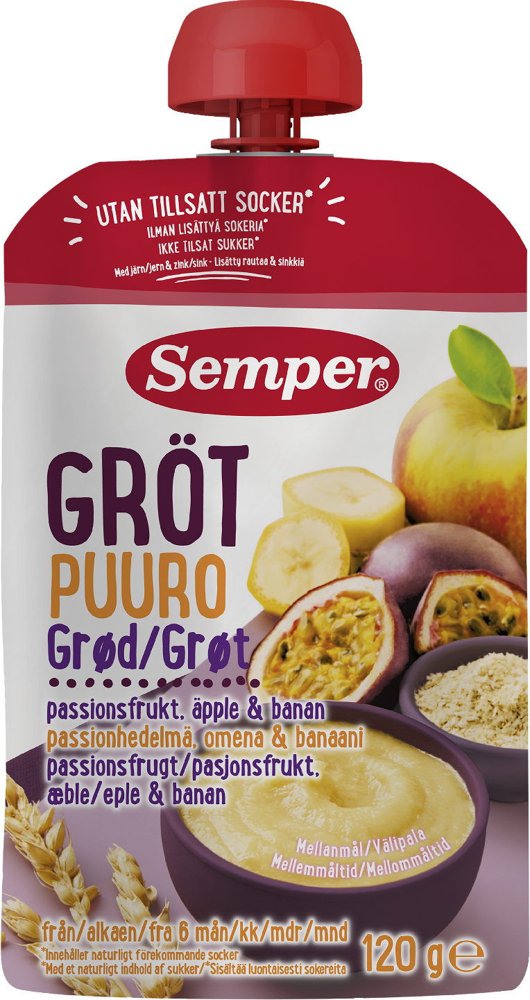 Semperin passionhedelmää, omenaa ja banaania sisältävä valmispuuro on täyttävä ja herkullinen välipala lapselle. Siinä on vähintään 50 % puuroa, ja sitä on täydennetty raudalla, kalsiumilla ja C-vitamiinilla.