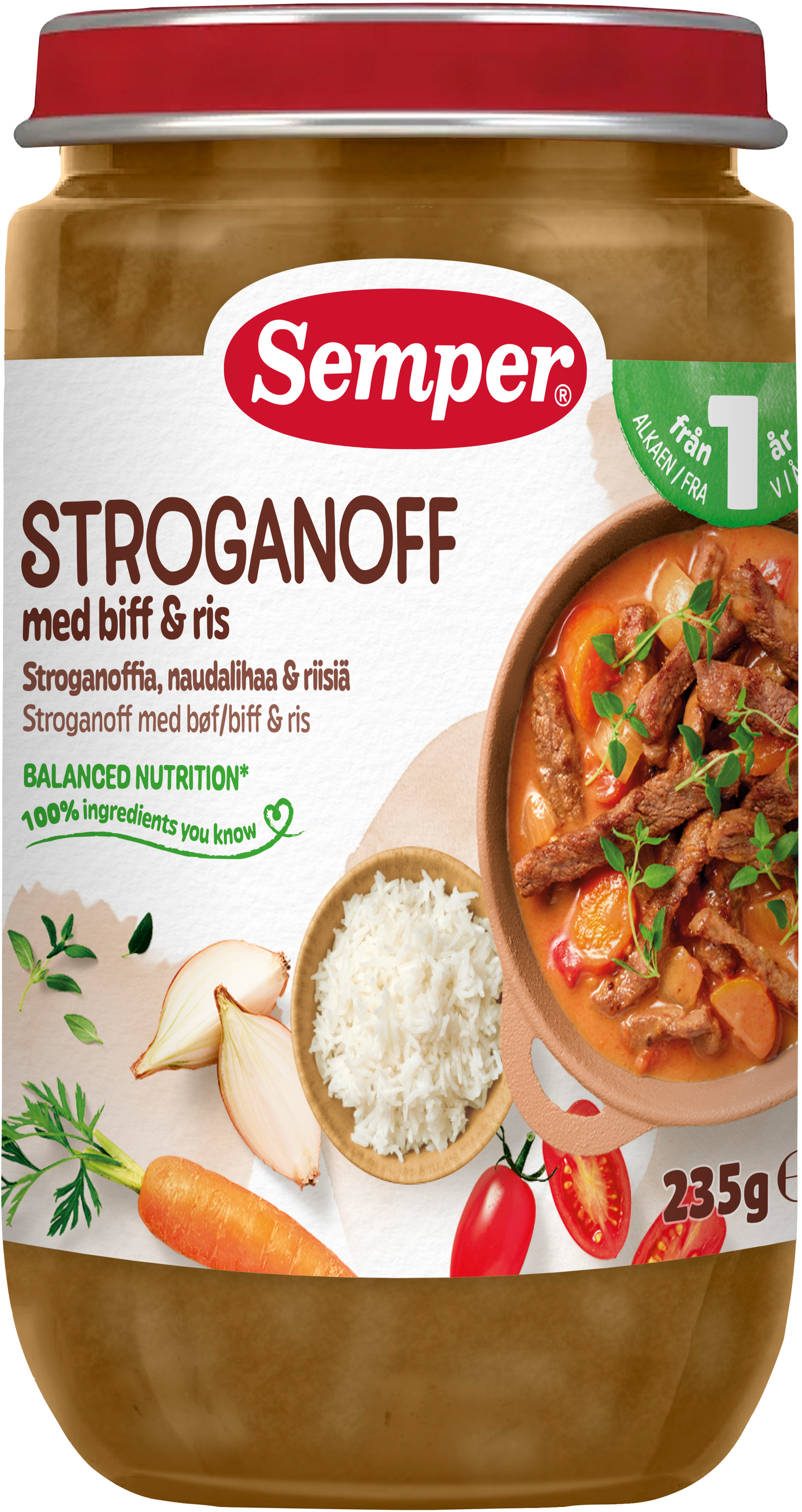 Semper Stroganoff, naudanlihaa ja riisiä on herkullinen pienten lasten ruoka. Ateria sopii lapsille noin yhden vuoden iästä alkaen. Vaikka yksivuotias syökin mielellään tavallista kotiruokaa, taaperoille tarkoitetut Semper-ateriat ovat helppoja ja monipuolisia vaihtoehtoja kotiruoalle. Kaikki Semper lastenruoka on valmistettu ilman lisättyä suolaa, sokeria tai säilöntäaineita.