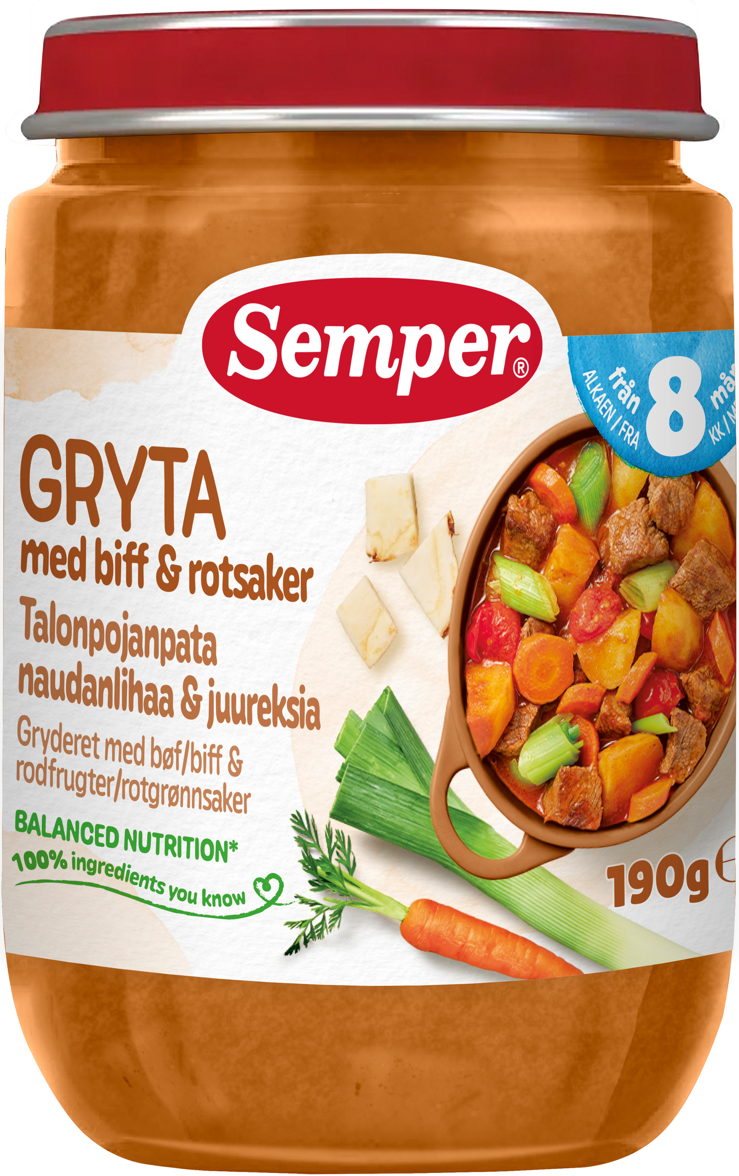 Lasten pata-ateria annospurkissa! Semper Talonpojanpata naudanlihalla ja juureksilla on herkullinen pienten lasten ruoka. Maidoton ateria sopii lapsille noin 8 kuukauden iästä alkaen. Sisältää sopivia pieniä paloja lapselle, joka opettelee pureskelemaan ruokaansa. Kahdeksan kuukauden ikäisille tarkoitettuja aterioita on myös maustettu hieman monipuolisemmin verrattuna 6 kuukauden ikäisten aterioihin. Kun lapsi tottuu miedosti maustettuihin aterioihin, hänen on helpompi siirtyä noin vuoden ikäisenä syömään samaa ruokaa muun perheen kanssa. Kaikki Semper lastenruoka on valmistettu ilman lisättyä suolaa, sokeria tai säilöntäaineita.