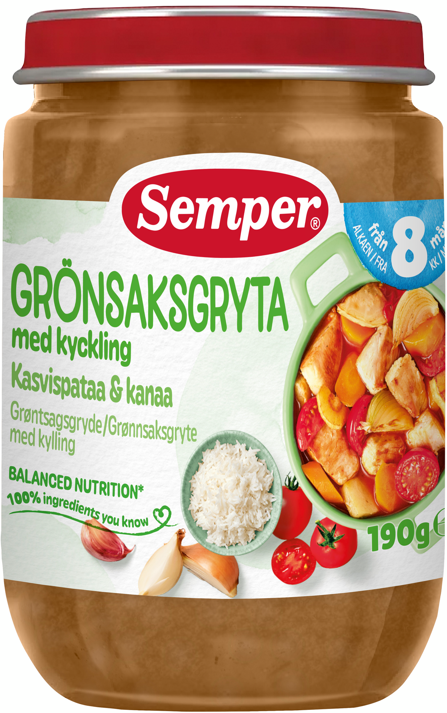 Semper Vihannes-kanapata & valkosipulia on terveellinen ja herkullinen pienten lasten ateria. Sisältää 55 % vihanneksia, kuten tomaattia, porkkanaa, sipulia ja palsternakkaa. Maidoton ateria sopii lapsille noin 8 kuukauden iästä alkaen. Sisältää sopivia pieniä paloja lapselle, joka opettelee pureskelemaan ruokaansa. Kahdeksan kuukauden ikäisille tarkoitettuja aterioita on myös maustettu hieman monipuolisemmin verrattuna 6 kuukauden ikäisten aterioihin. Kun lapsi tottuu miedosti maustettuihin aterioihin, hänen on helpompi siirtyä noin vuoden ikäisenä syömään samaa ruokaa muun perheen kanssa. Kaikki Semper lastenruoka on valmistettu ilman lisättyä suolaa, sokeria tai säilöntäaineita.
