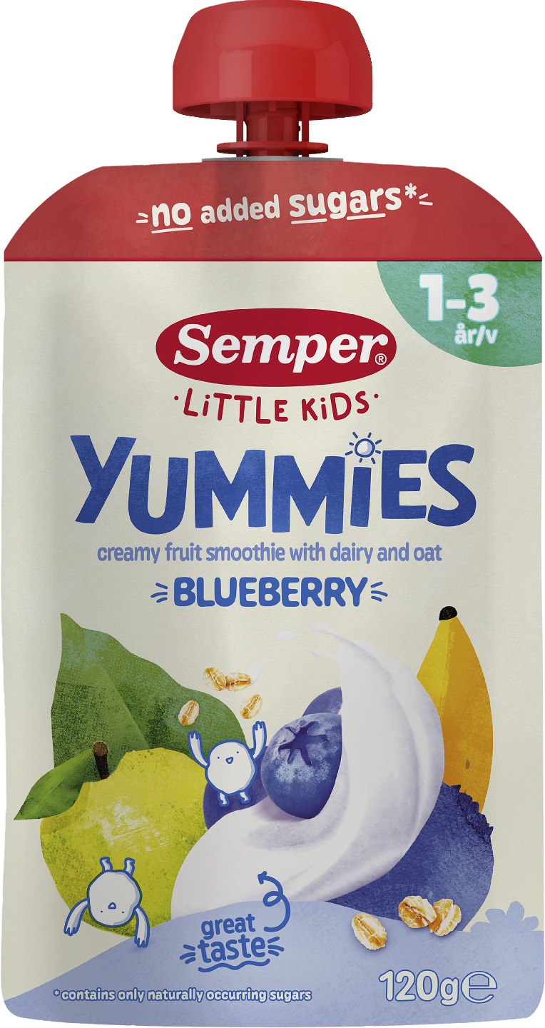 Makua ja kylläisyyttä samasta pussista. Semperin Yummies mustikka smoothie on ihanan herkullinen ja täyttävä välipala 1-3-vuotiaille lapsille. Yummies Mustikka smoothie sisältää hedelmiä ja marjoja, kauraa ja lämpökäsiteltyä jogurttia. Tästä täyttävästä välipalasmoothiesta saa myös proteiniinia ja kuitua.