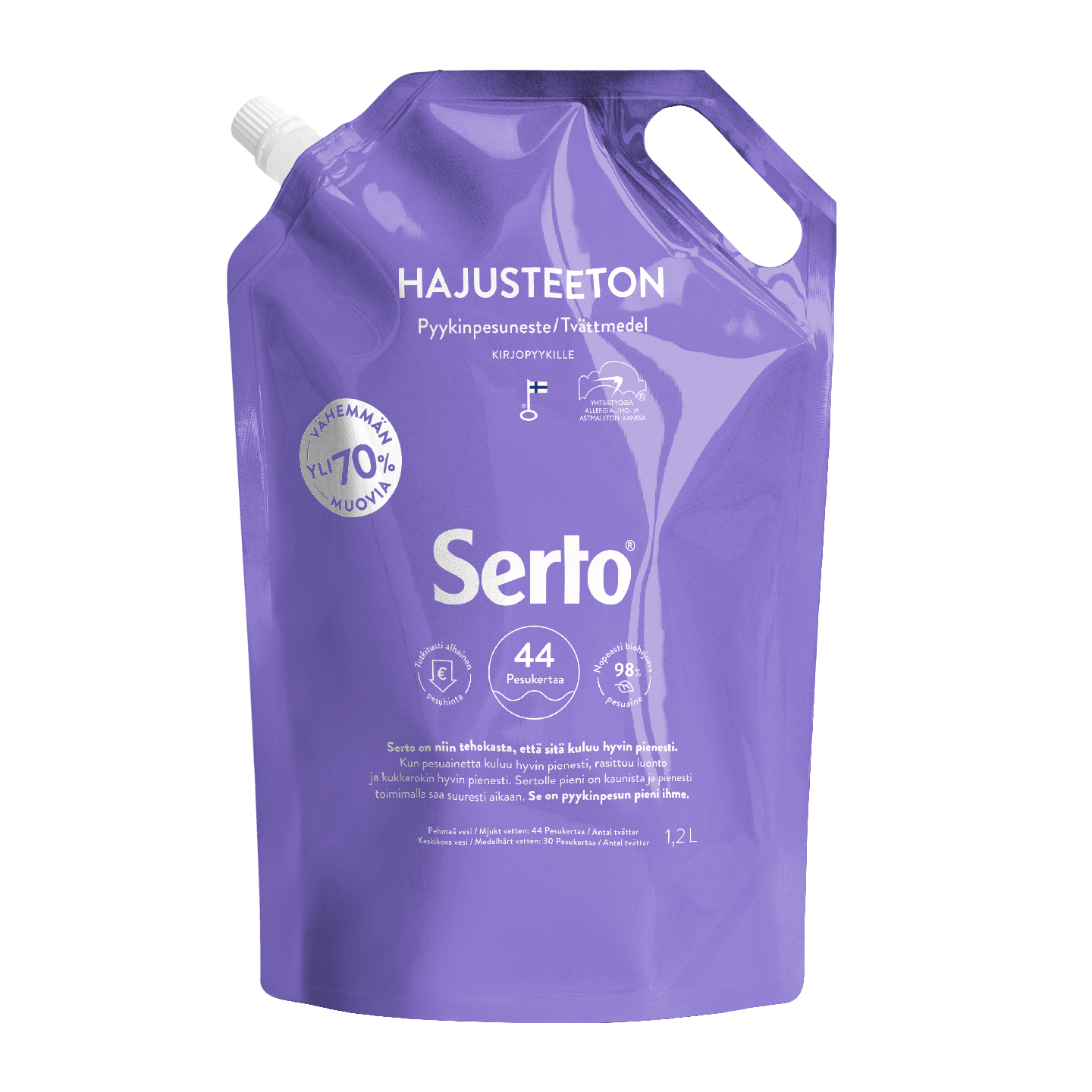 Puhdistaa tehokkaasti ja pitää värit kirkkaina. Serto Hajusteeton Pyykinpesuneste on suunniteltu erityisesti värillisen pyykin pesuun ja saavuttaa ihanteellisen pesutuloksen jo alhaisissa pesulämpötiloissa. Pyykinpesunesteen värisuoja suojaa tekstiilien värejä pesussa ja pitää ne kirkkaina. Hajusteeton. Ei sovellu villalle ja silkille.