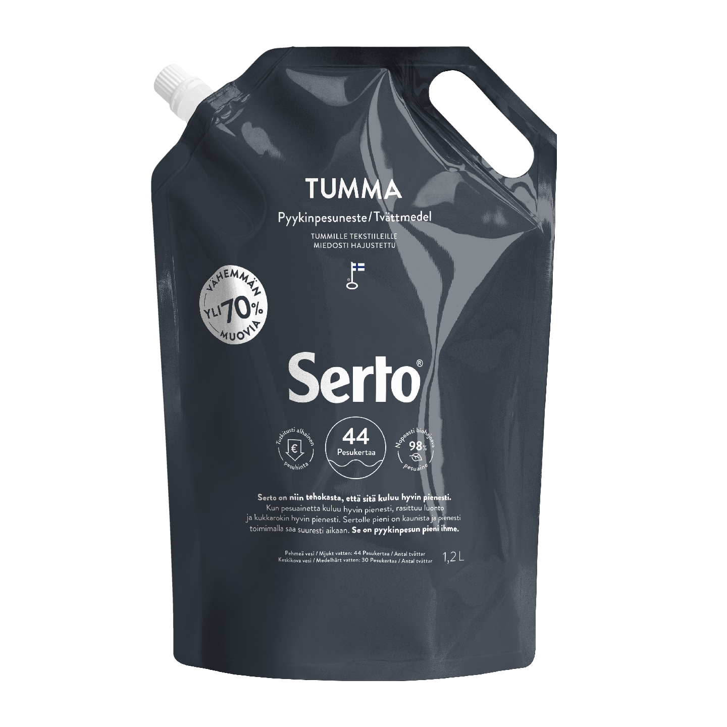 Pitää tummat tekstiilit tummina, estää nukkaantumista ja hoitaa kankaan pintaa. Serto Tumma Pyykinpesunesteeseen valitut pesuaktiiviset ainesosat hoitavat kankaan pintaa ja estävät tekstiilien nukkaantumista. Pesun jälkeen tekstiilisi ovat ihanan pehmeitä. Pyykinpesuneste on suunniteltu saavuttamaan ihanteellinen pesutulos jo alhaisissa pesulämpötiloissa. Miedosti hajustettu. Ei sovellu villalle ja silkille.