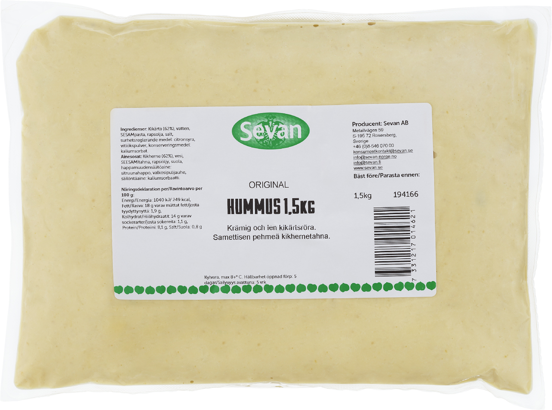 Sevan Hummus Original on Pohjoismaiden ostetuin hummus. Se tunnetaan silkkisestä ja silkkisestä koostumuksestaan. Sevan Hummus Original sopii täydellisesti falafelin seuraksi, kulhoruokiin ja lisukkeeksi useimpiin lämpimiin ja kylmiin ruokiin. Valmistetamme hummuksen omassa tehtaassamme Sigtunassa, Tukholman pohjoispuolella.