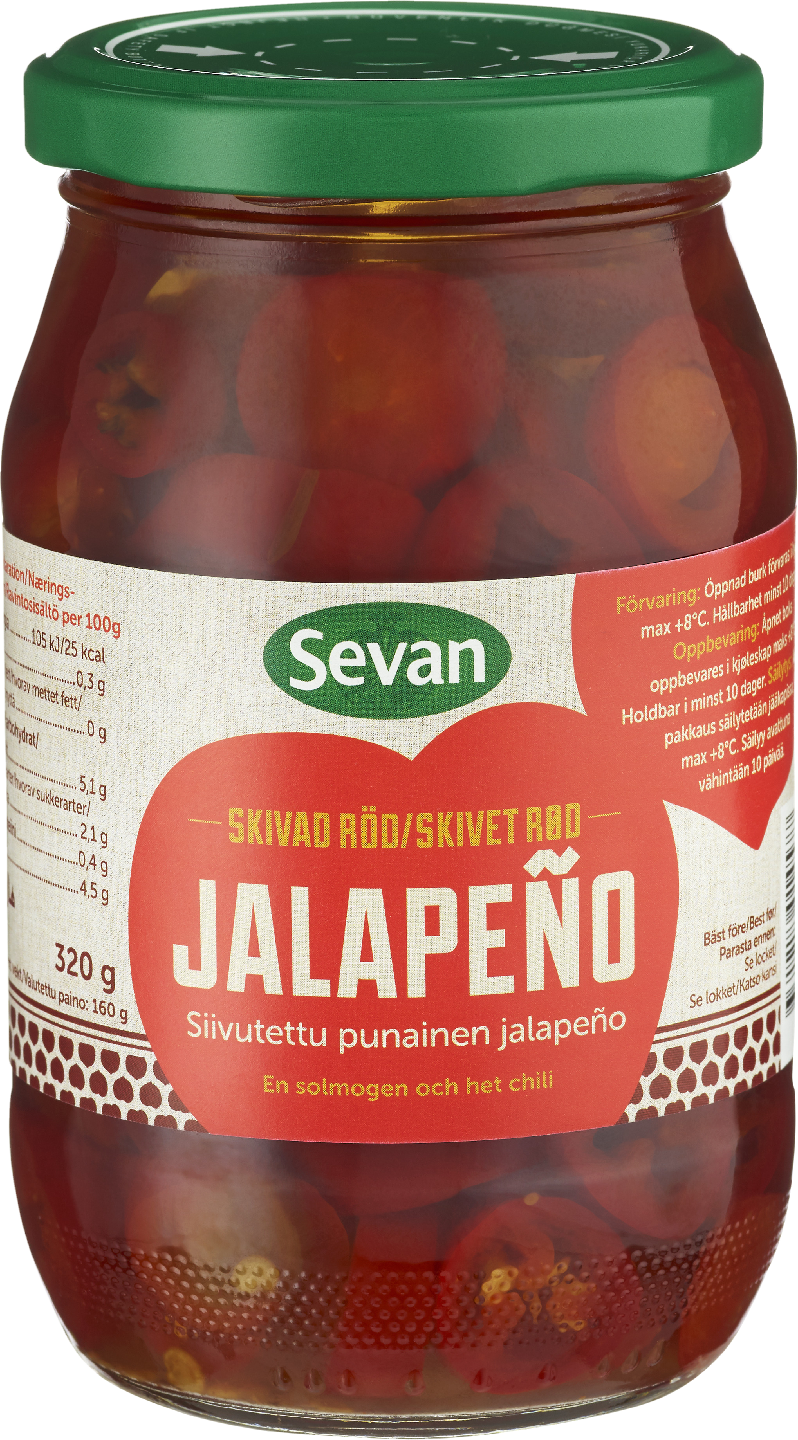 Tulinen, siivutettu, punainen chili, sama chili kuin vihreä, sillä erotuksella että se on saanut kypsyä auringossa. Maku on hieman tulisempi ja makeampi. Vihreän jalapenon tavoin punaista jalapenoa voi syödä sellaisenaan, tacojen, grillatun ruuan ja bugereiden kanssa!