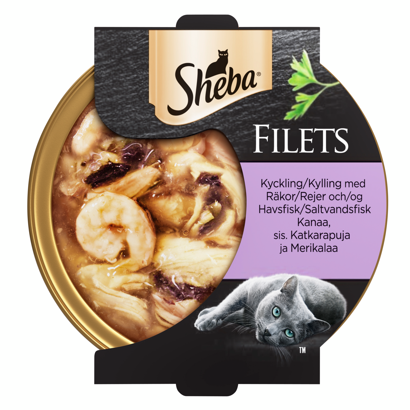 Sheba Filet sis. kanaa ja katkarapua on valmistettu vain mehukkaimmista kanapaloista ja herkullisista katkaravuista, kevyesti ylelliseen kastikkeeseen kastettuna. Hienointa kissan märkäruokaa puhtaista raaka-aineista, aito ilo kissasi aisteille.