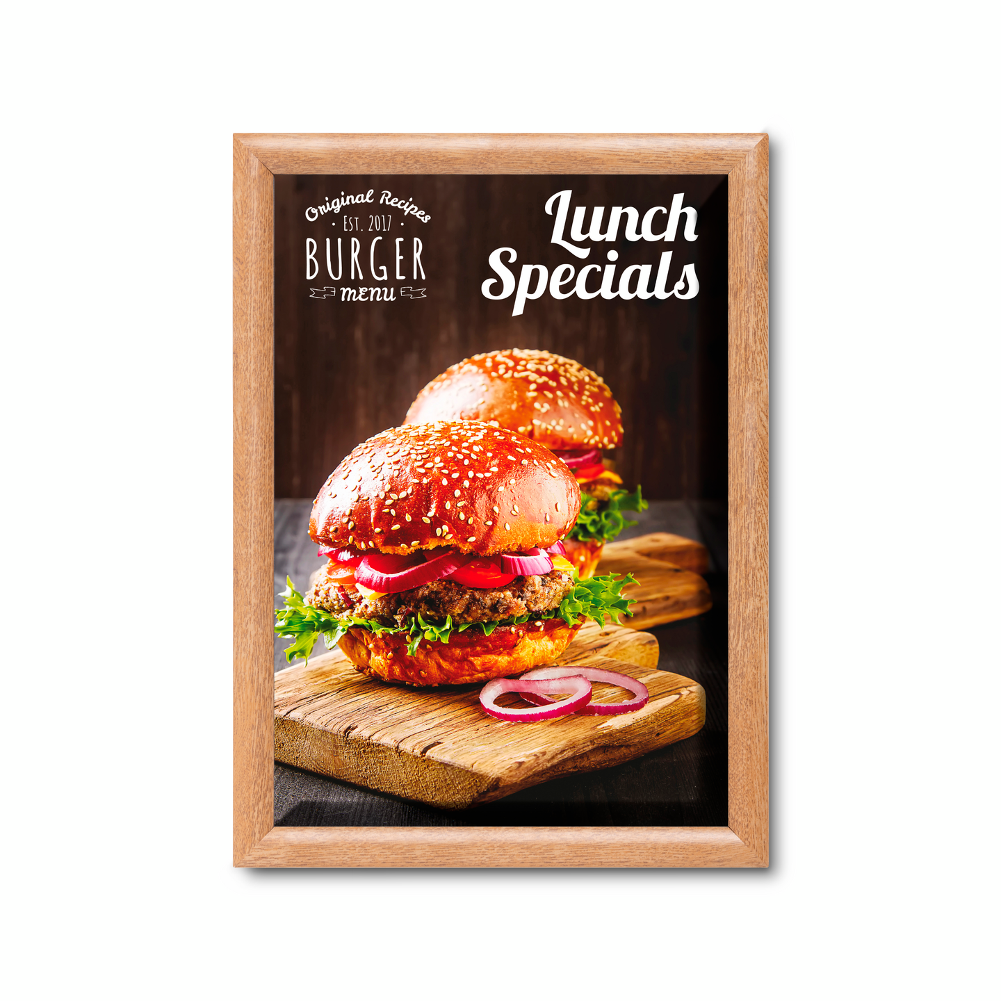 A3 Kääntökehys puunvärisillä alumiinisilla 25mm kehyksillä. Seinään kiinnitettävä, tai koukuilla ripustettava. Mukana häikäisemätön muovikalvo.
