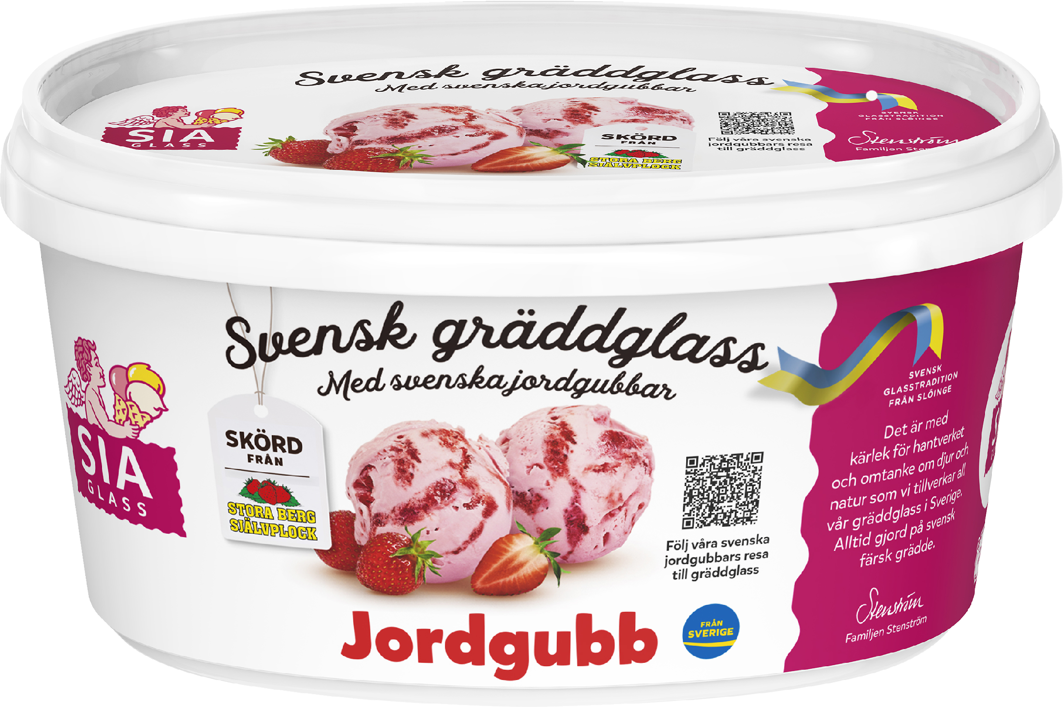 Lempeän herkullista mansikkajäätelöä tuoreesta ruotsalaisesta kermasta ja ruotsalaisista mansikoista, jotka on poimittu marjatilalta tehtaamme läheisyydestä. Valmistettu tehtaallamme Slöingessä.
