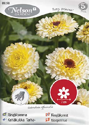 Kerrottu kehäkukka vaaleankeltaisen, lähes valkoisen sävyissä. Keskusta on tummempi, kermanvalkoinen. Koristeelliset terälehdet voi syödä, esim. salaatissa. Leikkaa kuihtuneet kukat pois tai anna siementen kehittyä kylvöön. Kasvit voi syksyllä kääntää maahan viherlannoitteksi