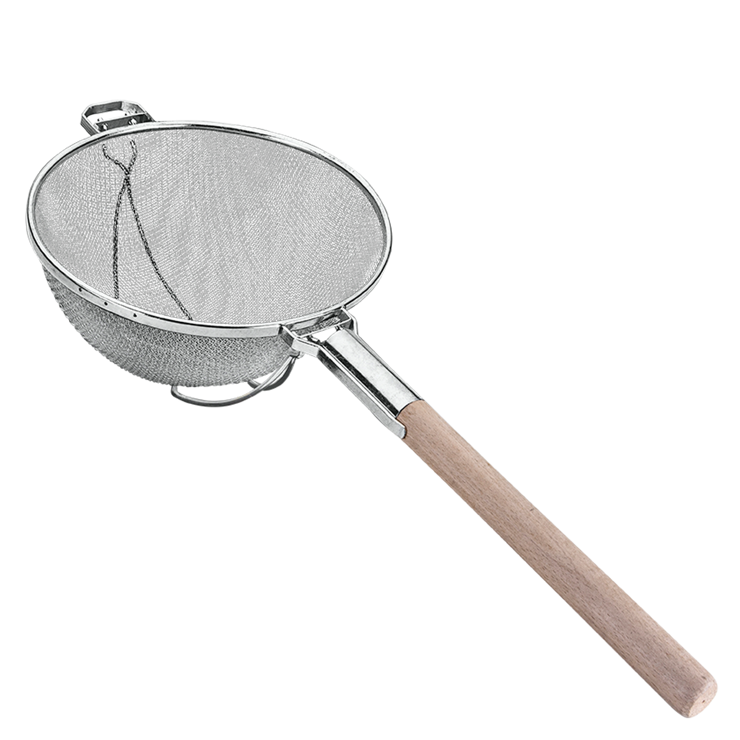Siivilä tinattu 30 cm suurkeittiö, metallivahviste, kaksoisverkko, pyöreä puukahva