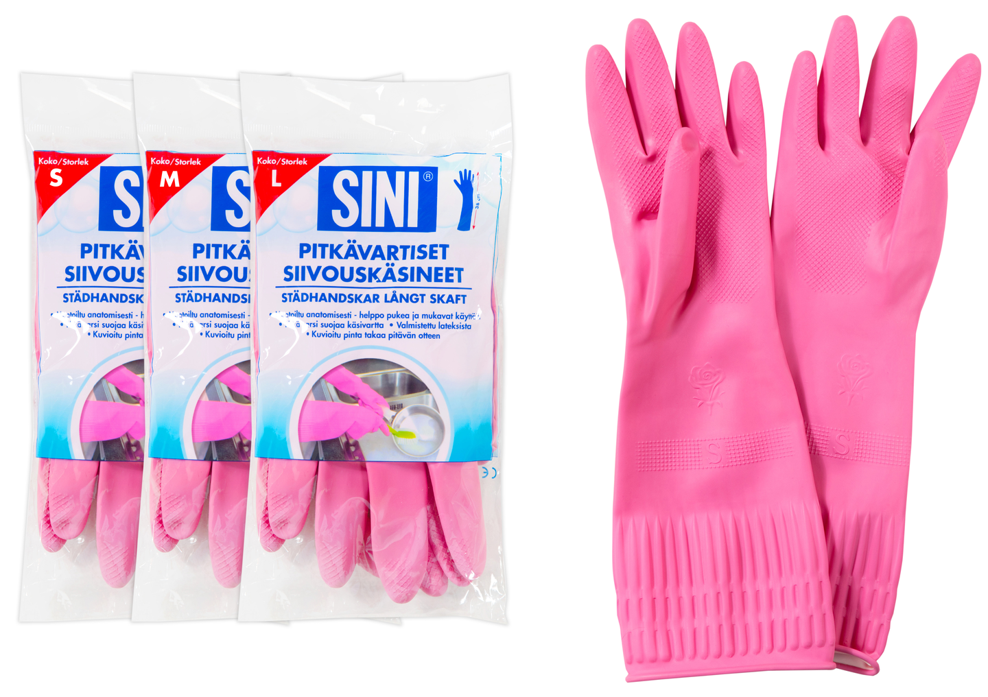 Siivouskäsine, joka on kaunis kuin karkki ja erittäin mukava kädessä. Pitkävartisia siivouskäsineitä on saatavilla kolmessa eri koossa ja ne on muotoiltu anatomisesti, joten sinun käsillesi löytyy taatusti mukava ja hyvin suojaava käsine, joka on helppo pukea päälle ja riisua pois.