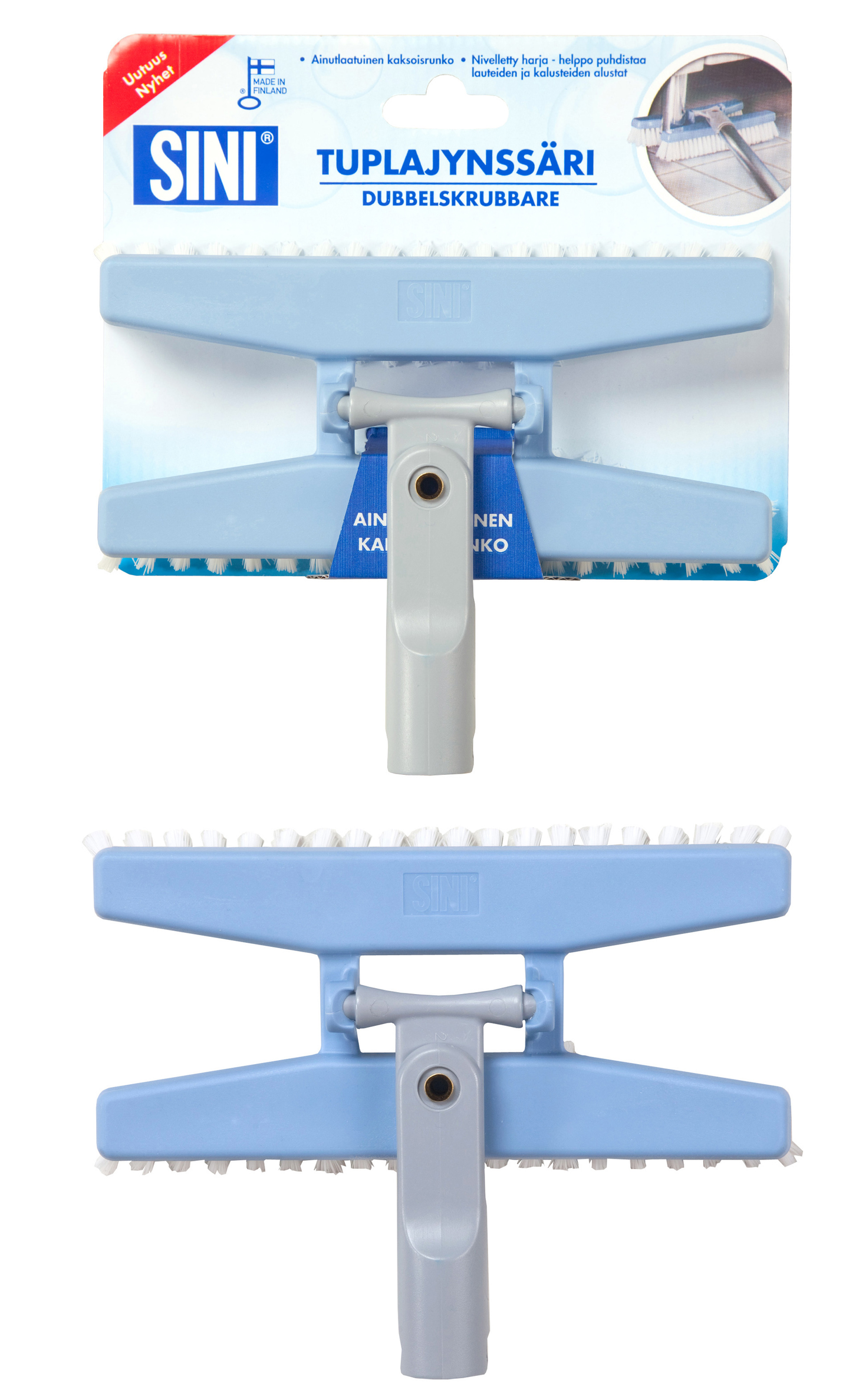 Harjassa on ainutlaatuinen kaksoisrunko, jolla kuuraus onnistuu myös kalustejalkojen ympäriltä sekä suorat reunat ja kalteva harjastus, mikä mahdollistaa kylpyhuoneen lattian silikonisaumojen puhdistuksen kumartelematta.