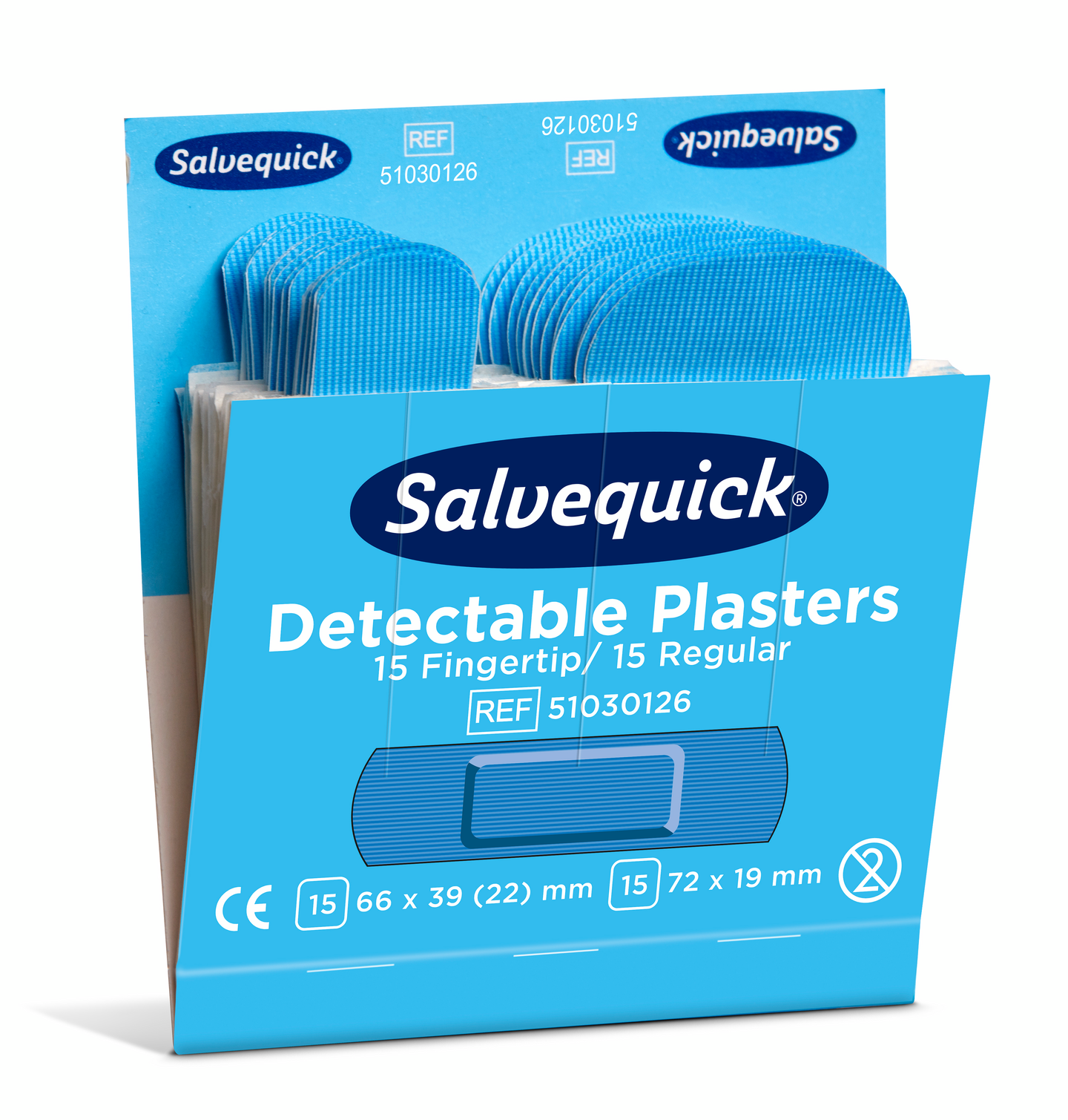 Salvequickin sininen muovilaastari soveltuu erityisesti elintarvikkeiden käsittelypisteisiin. Laastari on erittäin hyvin kiinnittyvä, helppo havaita ja se voidaan jäljittää useimmilla elintarviketeollisuudessa käytettävillä metallintunnistimilla. Laastarit ovat joustavia ja allergiatestattuja. Pakkauksessa kaksi eri kokoa: tavallinen- ja sormenpäälaastari.