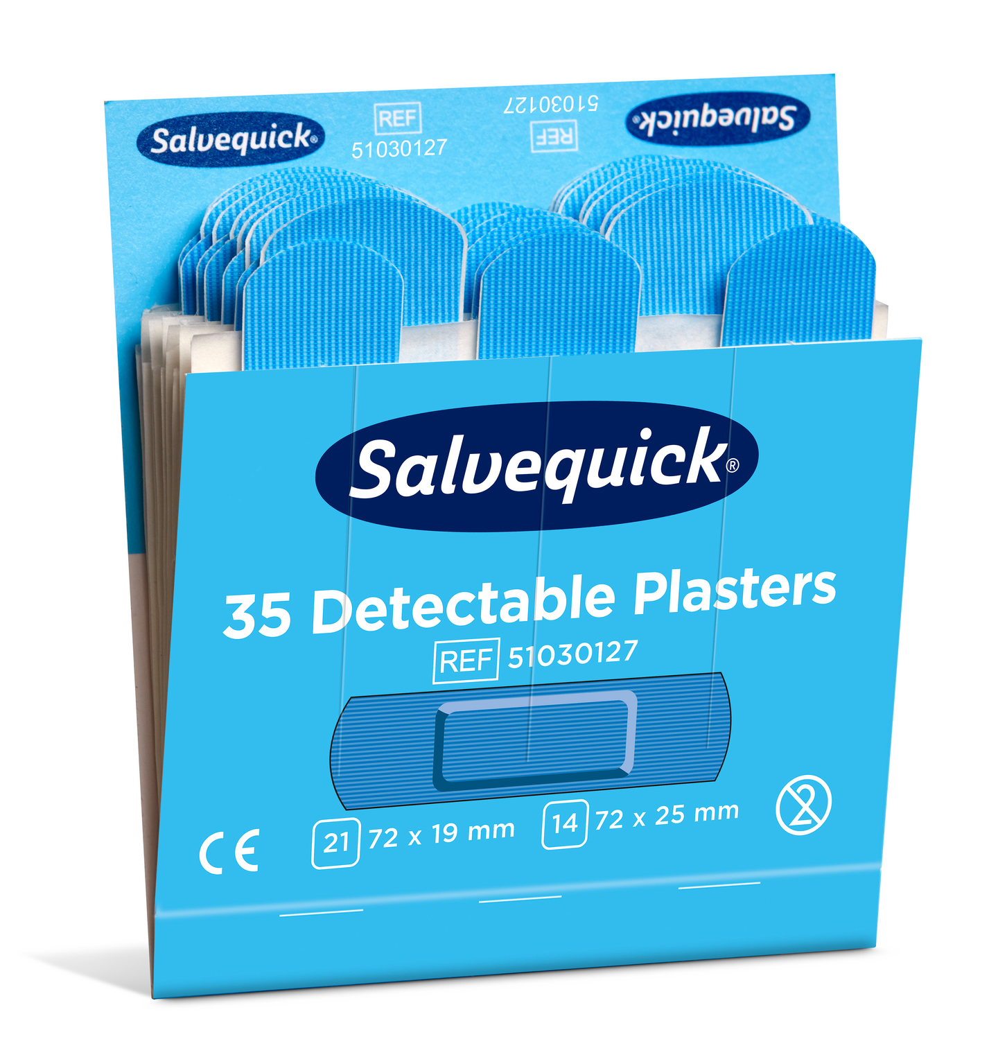 Salvequickin sininen muovilaastari soveltuu erityisesti elintarvikkeiden käsittelypisteisiin. Joustava ja erittäin hyvin kiinnittyvä. Laastari on helppo havaita ja se hälyttää useimmissa elintarviketeollisuudessa käytetyissä metallintunnistimissa. Allergiatestattu. Täydennyspakkaus Salvequick laastariautomaattiin, sis. 6 x 35 kpl (2 eri leveyttä 19 mm ja 25 mm).