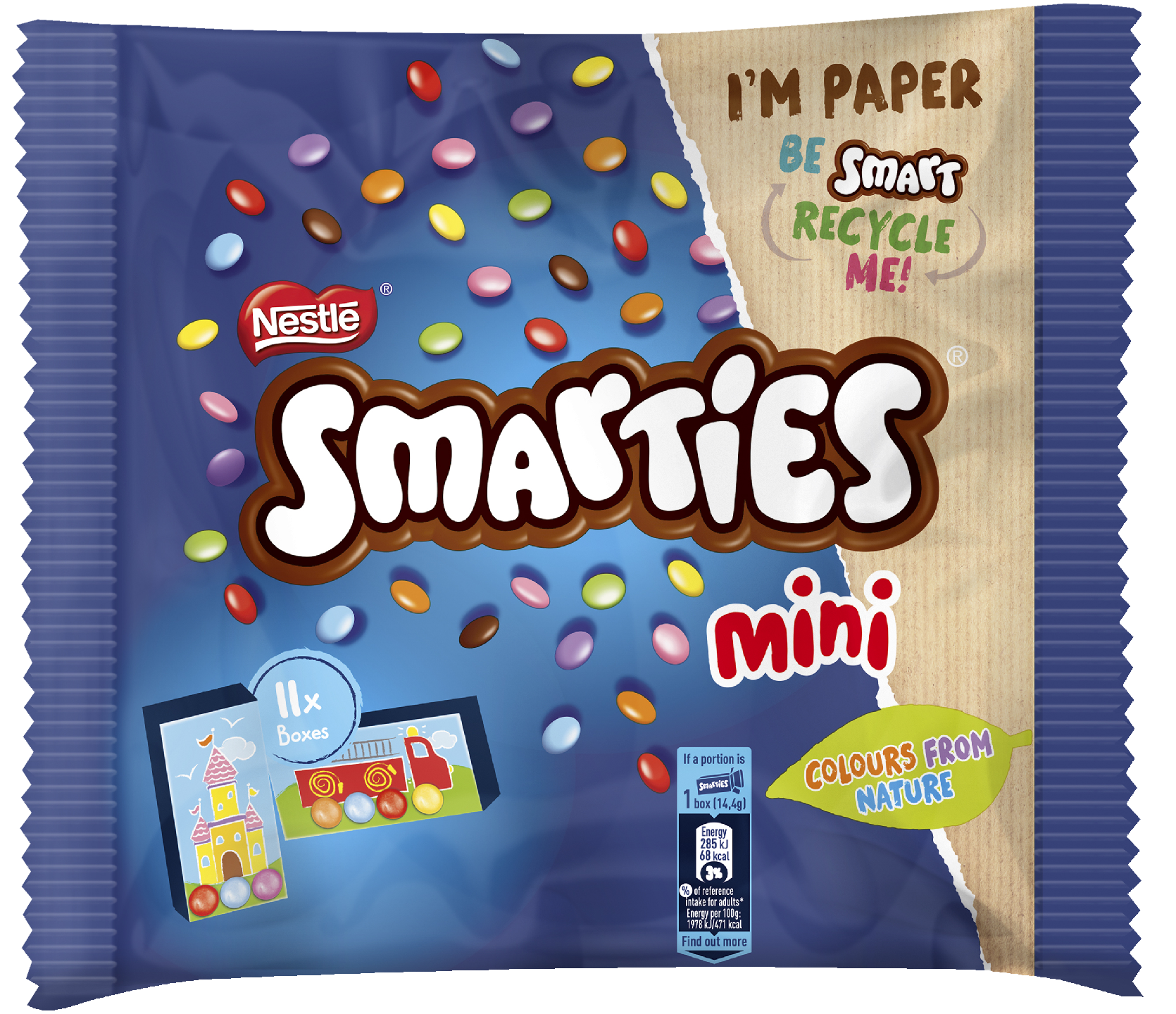 Nestlé Smarties, herkullista sveitsiläistä maitosuklaata ja värikkäitä pieniä Smarties-rakeita.