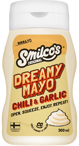 VegaaninenHerkullinen vegaaninen majoneesi! Smilco's Dreamy Mayo on maustettu kevyesti chilillä ja valkosipulilla sekä sisältää runsaasti rypsiöljyä ja hyviä rasvoja. Erityisen hyvin Smilco’sin Dreamy Mayo – sopii nautittavaksi tacojen, tortillojen, hampurilaisten sekä erilaisten uuni- tai grilliruokien kera.