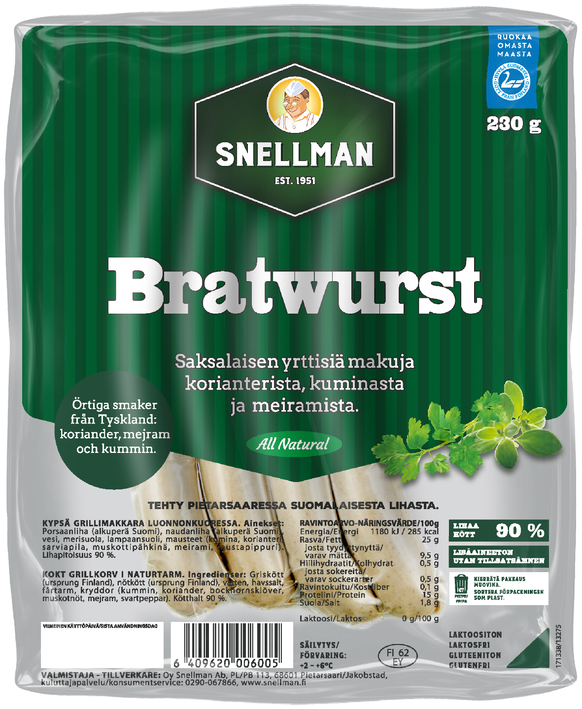LaktoositonAll Natural. 100 % suomalaista lihaa, ei nitriittiä eikä lisättyä fosfaattia. Vain puhtaat, luonnolliset raaka-aineet. Kumina, mustapippuri, meirami, korianteri ja muskottipähkinä tuovat herkullisen, omaleimaisen makunsa Bratwurstiin. Aito kotimainen Bratwurst!