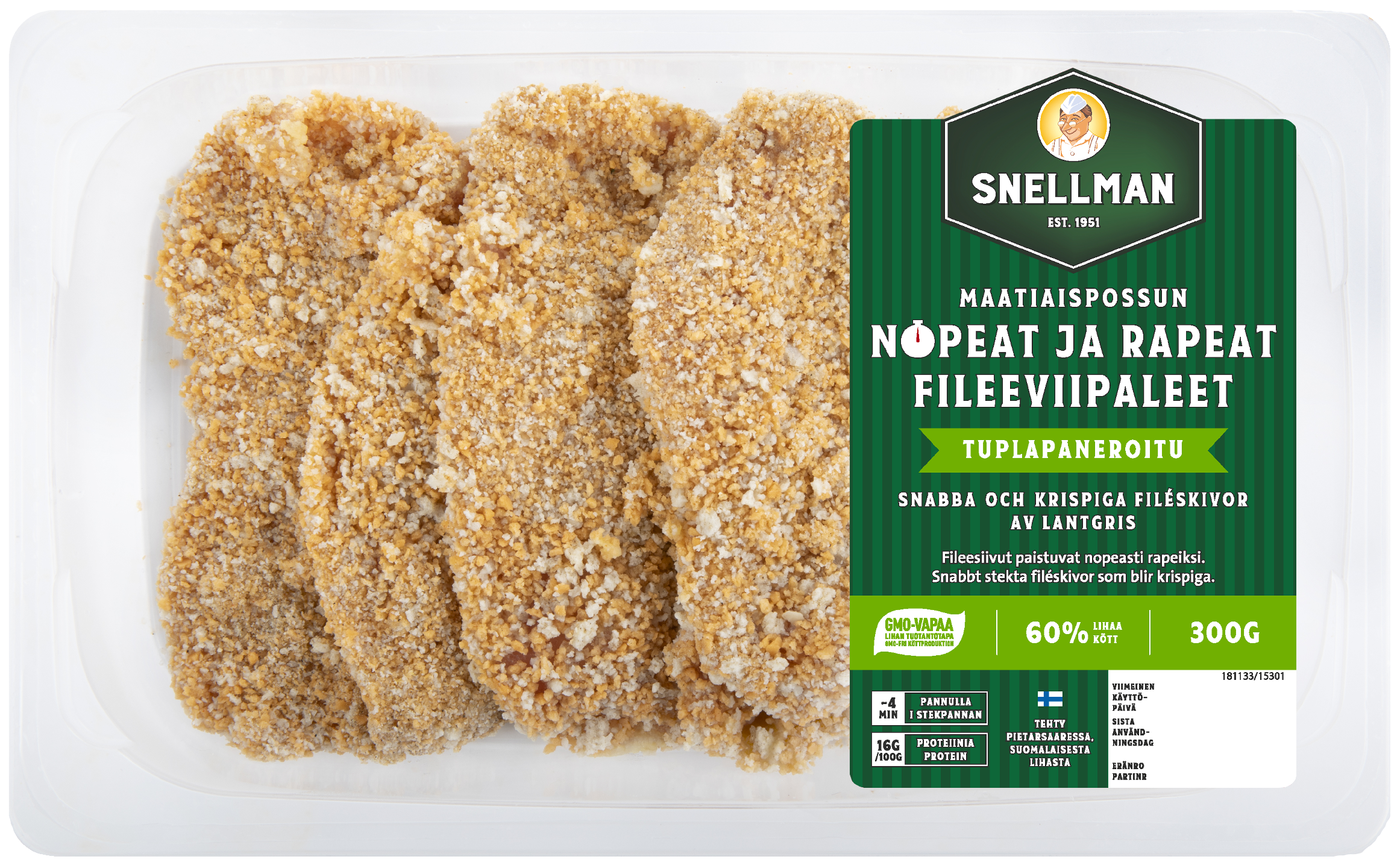 LaktoositonSnellmanin Maatiaispossun nopeat ja rapeat fileeviipaleet ovat nimensä mukaisesti nopeita valmistaa, ja laadukkaan tuplapaneroinnin ansiosta niistä tulee uskomattoman rapeita ja meheviä. Kotimaisesta maatiaispossun ulkofileestä ohueksi leikatut ja valmiiksi maustetut pihvit helpottavat ruoanlaittoa ja maistuvat koko perheelle.