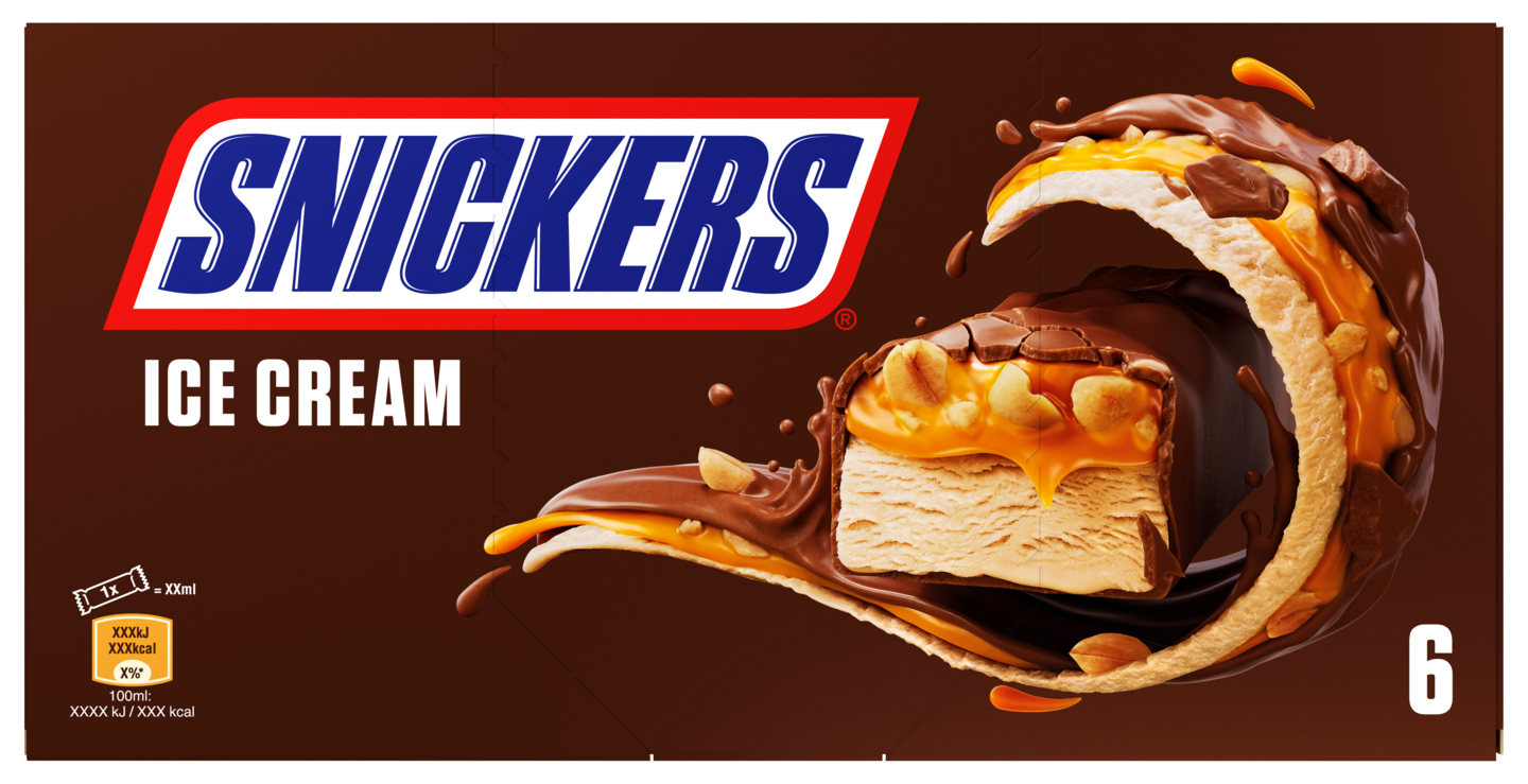 SNICKERS®-kermajäätelöpatukka sisältää kermajäätelöä, paahdettuja pähkinöitä ja karamelliä kaakaokuorrutuksen sisällä. SNICKERS® kermajäätelöpatukka 6*48g