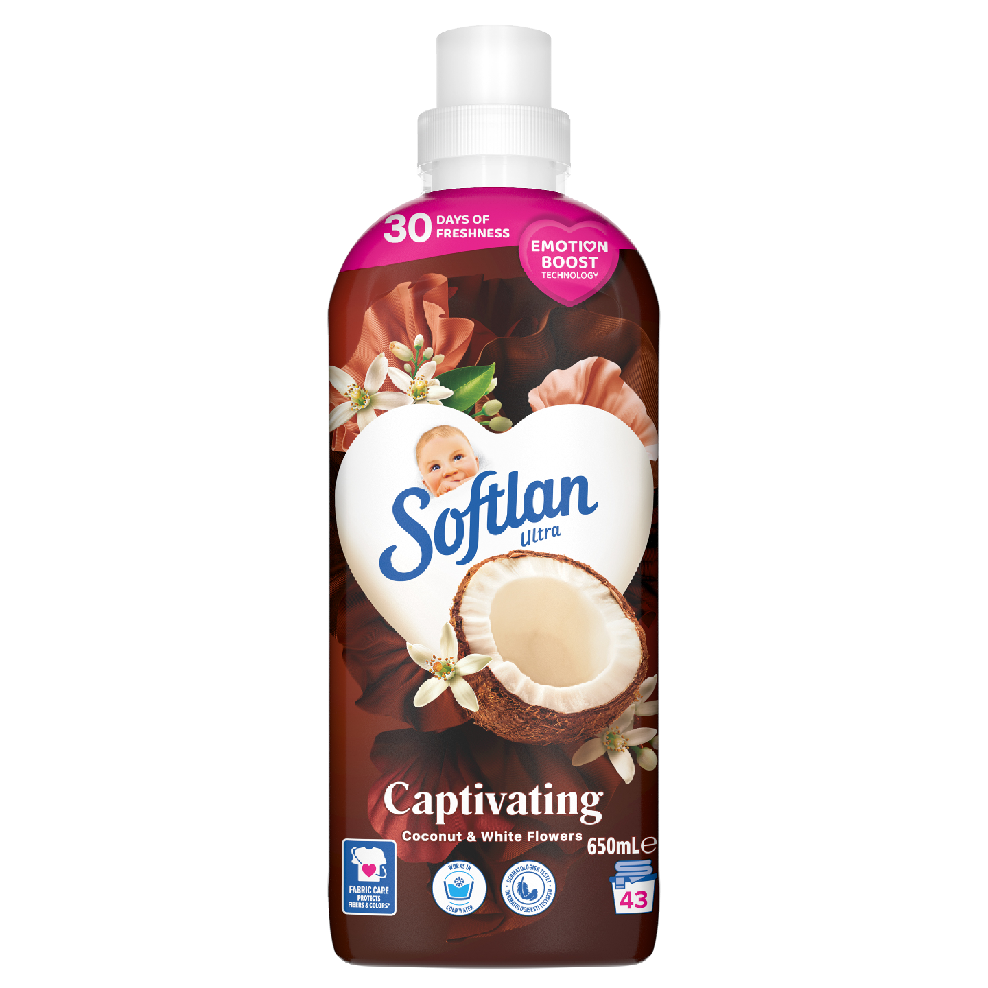 Softlan Emotions Captivating Coconut & White Flowers -huuhteluaine tekee pyykistäsi ihastuttavan pehmeää ja helppoa käsitellä. Se jättää peräänsä jopa 30 päivää kestävän herkullisen kookoksen ja hienostuneiden kukkien tuoksun, jonka Emotiboost-teknologia on suunniteltu parantamaan mielialaa. Soveltuu kaikille kankaille ja tekee pyykistäsi helpommin käsiteltävää kuin pelkällä pesuaineella pestynä. Softlan Emotions Captivating Coconut & White Flowers -huuhteluaineen pullo on valmistettu 100% kierrätetystä muovista, ja voit myös uudelleen kierrättää sen korkin kanssa.