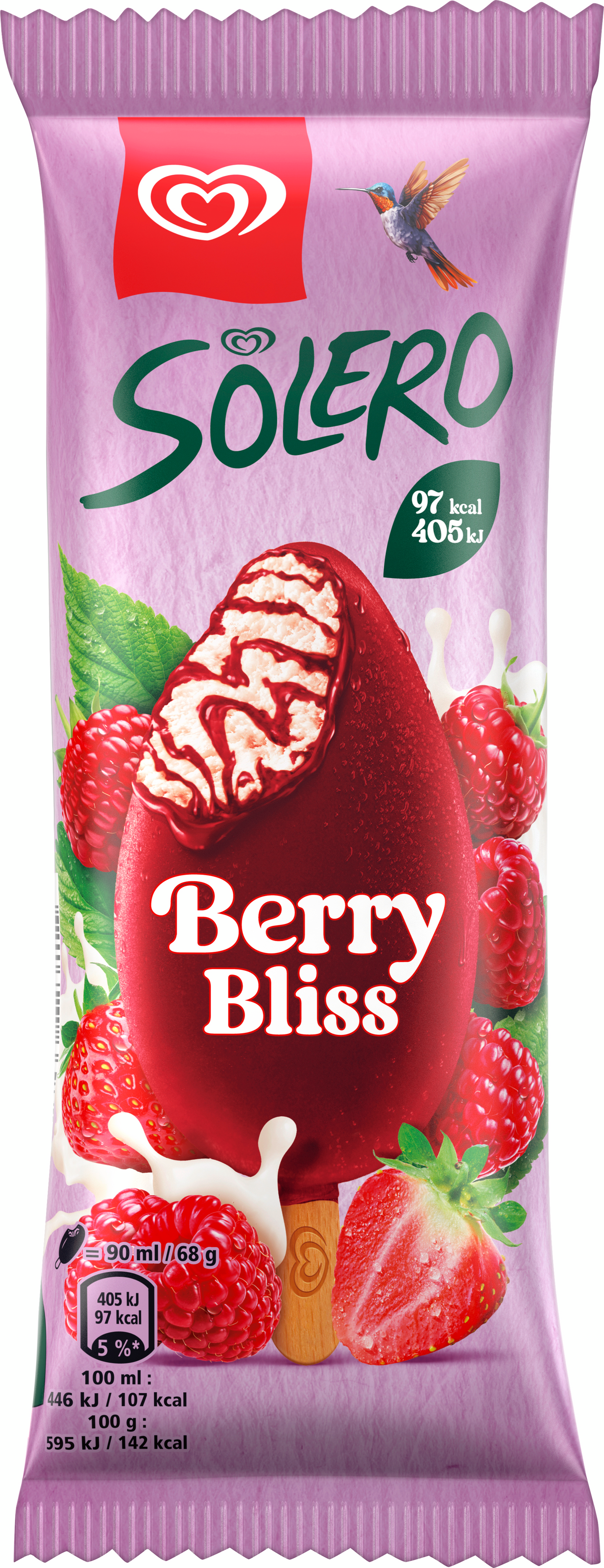 Solero Berry Bliss on gluteeniton jäätelöpuikko, joka on todellinen marjojen ystävien valinta! Siinä maistuu ihanan kermainen vaniljajäätelö ja marjaisen kirpeä marjakastike kuorrutettuna mansikka- ja vadelmasorbetilla. Ihanan raikas jäätelö herkutteluhetkiin! Solero-jäätelöissä ei käytetä keinotekoisia väri- tai makuaineita. Solero Berry Bliss -jäätelö sisältääkin 19 % marjoja ja sen maku on raikkaan marjaisa. Aidon marjaisassa Solero Berry Bliss -jäätelöpuikossa maistuu herkullinen mansikka ja vadelma, ja siinä on energiaa alle 100 kcal per jäätelö. Nauti nyt ihastuttavasta makujen yhdistelmästä ja raikkaasta jäätelöstä! Todellisille Solero-jäätelön ystäville löytyy myös monipakkaus, joka sisältää 3 gluteenitonta Solero Berry Bliss -jäätelöpuikkoa. Jos ihastuit Solero Berry Bliss -jäätelöön, mitä jos kokeilisit myös Solero Exotic -jäätelöä? Siinä maistuu ananas, mango, persikka ja passionhedelmä – virkistävä makuyhdistelmä, joka jää mieleen. Jäätelö on erinomainen jälkiruoka, pieni välipala tai makeannälän taltuttaja, kun herkkuhammasta kolottaa. Jäätelö maistuu lähes jokaiselle, niin lapsille kuin aikuisille. Se on kätevä tarjottava, kun saat yllätysvieraita tai haluat juhlistaa tilaisuutta. Jäätelö ilostuttaa niin elämän pienissä kuin suurissa hetkissä ja nostaa tavallisen ruokailun arjen yläpuolelle. Jäätelöillämme on vahva yhteys kaikenikäisten jäätelörakastajien kanssa ja haluamme olla mukana ilon hetkissä. Jäätelövalikoimastamme löytyy tuttuja klassikoita ja jännittäviä uutuuksia, joita kehitämme muuttuvien makujen mukaan. Unileverin jäätelöt luovat päivittäin ympäri maailmaa onnenhetkiä ihmisille. Juhlistamme tätä toimintaa sponsoroimalla virallisesti Yhdistyneiden kansakuntien kestävän kehityksen ratkaisuverkoston (SDSN) onnellisuusraporttia. Olemme tuoneet ihmisiä yhteen jäätelön avulla ja levittäneet onnellisuutta sosiaalisten yhteyksien kautta. Sponsorointisopimus on uusin askel Unileverin sitoutumisessa kansallisten onnellisuustasojen nostamiseen. Se on osa pyrkimystämme korostaa ihmisten välisten sosiaalisten yhteyksien merkitystä onnellisuuden lisäämisessä.