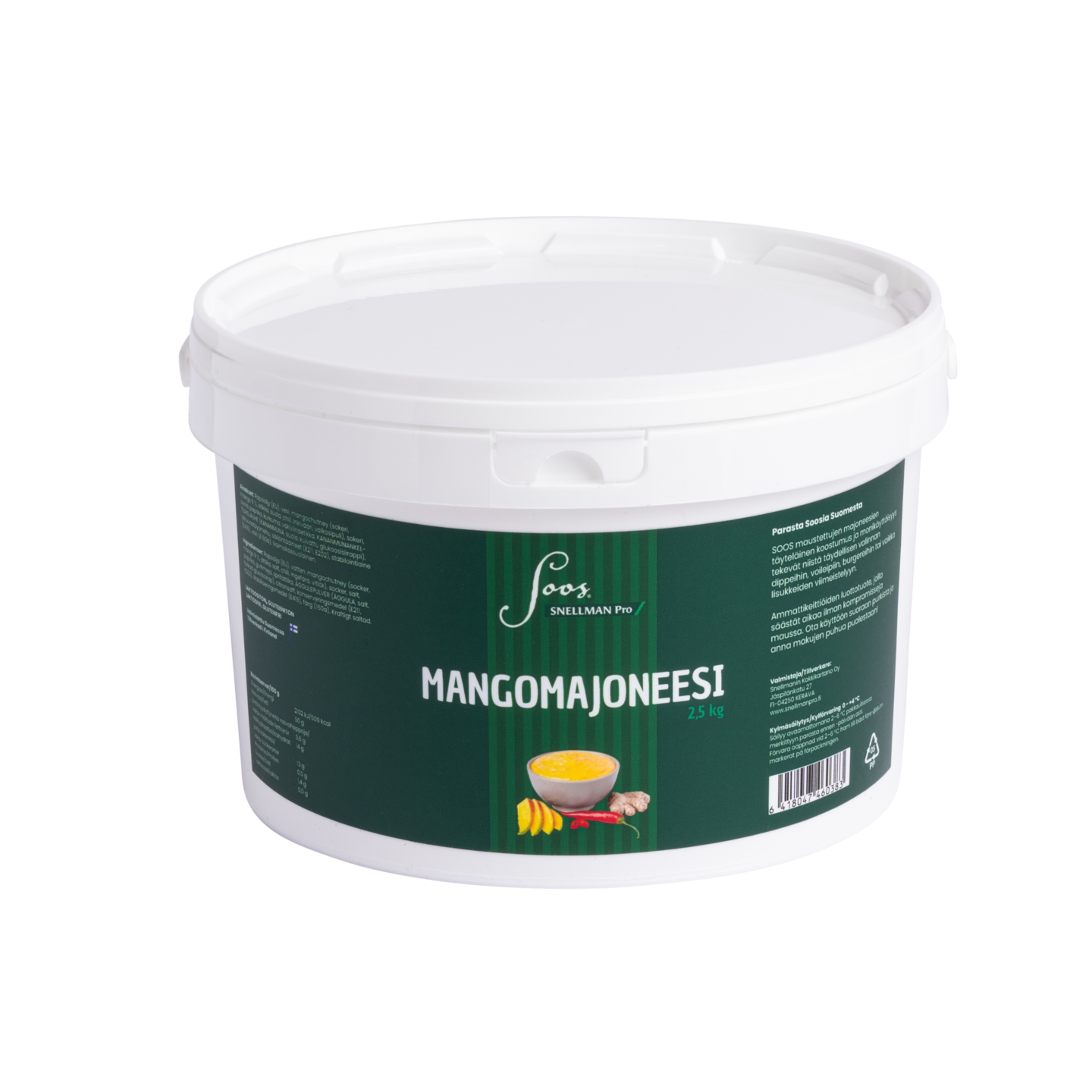 Rapsiöljy, vesi, mangochutney (sokeri, mango, etikka, suola, chili, inkivääri, valkosipuli), mausteseos [sokeri, kurkuma, paprikasuola, KANANMUNANKELTUAISJAUHE 0,8% (KANANMUNA, suola, kuivattu glukoosisiirappi), säilöntäaine (E211, E202), stabilointiaine (E415 ksantaanikumi), chili, valkosipuli, inkivääri, väri (E160a)], väkiviinaetikka, sitruunatäysmehu. Voimakassuolainen.