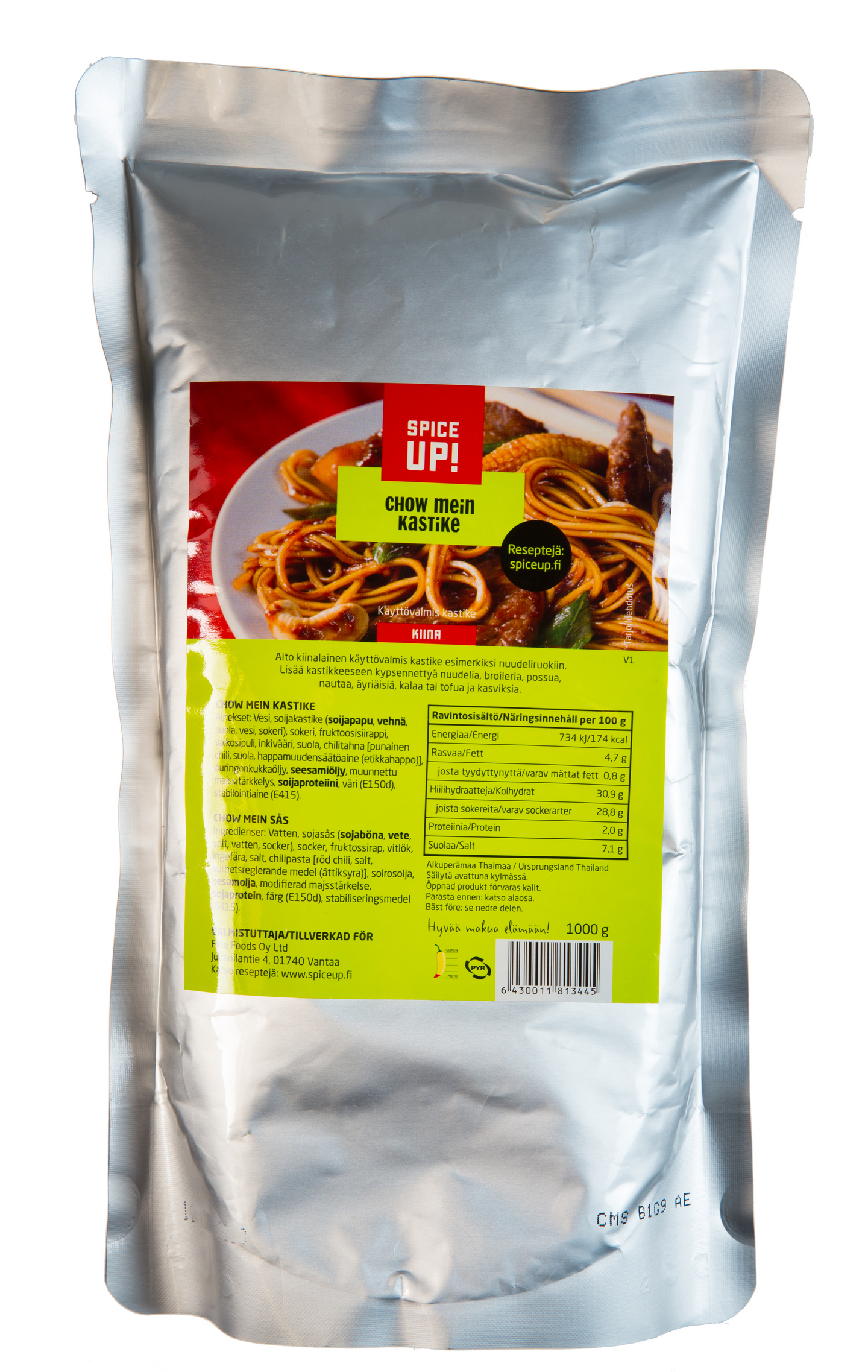 VegaaninenSpice Up! Chow Mein kastike on kiinalainen soijakastikepohjainen mieto käyttövalmis kastike. Perinteisesti chow mein kastiketta käytetään paistettujen nuudeliruokien maustamiseen. Chow Mein kastike sopii sellaisenaan wokkikastikkeeksi, keittoihin, nuudeli- ja riisiruokien maustajaksi.