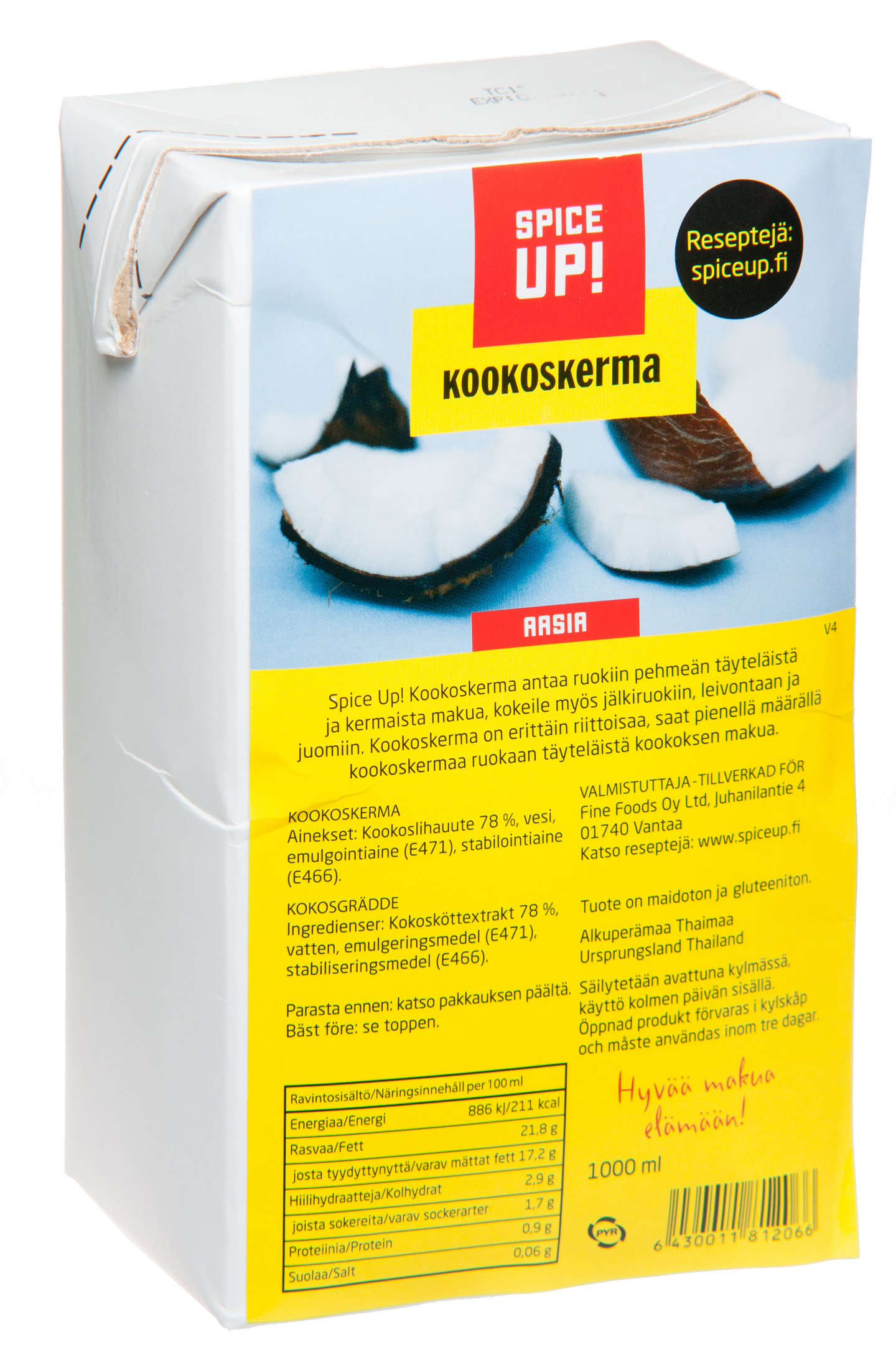 VegaaninenSpice Up! Kookoskerma sopii kaikkeen ruoanvalmistukseen; kokeile myös jälkiruokiin, leivontaan ja juomiin. Kookoskermalla saat ruokaan ainutlaatuista pehmeyttä ja tuulahduksen aasialaista makumaailmaa. Kookoskerma valmistetaan kookoshedelmän lihasta. Jos kookoskerma saa kylmää, se saattaa jähmettyä. Tämä ei kuitenkaan vaikuta tuotteen maku- tai käyttöominaisuuksiin. Kookospähkinöiden keruussa ei ole käytetty apinatyövoimaa.