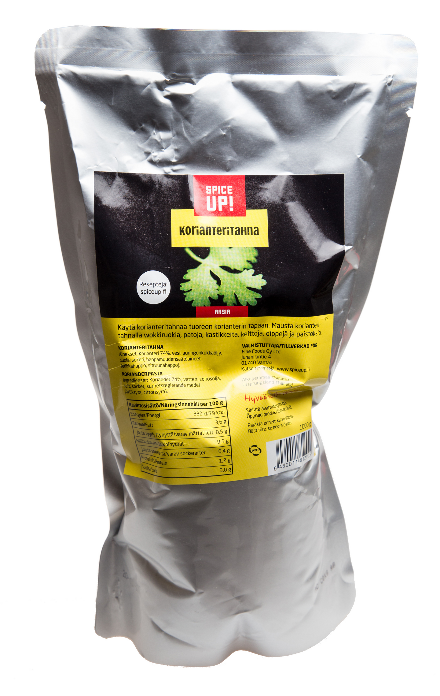 VegaaninenSpice Up! Korianteritahna on monikäyttöinen tuoreesta korianterista valmistettu tahna, joka sopii käytettäväksi tuoreen korianterin tapaan kaikessa ruoanvalmistuksessa. Korianteri kuuluu oleellisena osana aasialaiseen keittiöön. Mausta korianteritahnalla esimerkiksi wokruokia, patoja, kastikkeita, murekkeita, keittoja, paistoksia, leipätaikinoita ja dippikastikkeita. Avattu pakkaus säilyy kylmässä useita viikkoja.
