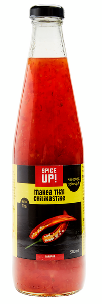 VegaaninenSpice Up! Makea Thai chilikastike on makea ja mieto chilikastike, joka sopii kaikkeen maustamiseen ja kastikkeeksi sellaisenaan. Aasialaisten chilikastikkeiden pääraaka-aine on tulinen chili, joka käytetään useimmiten siemenineen. Tässä makeassa chilikastikkeessa tulisuutta taittaa kastikkeen makeus. Se on erinomaista myös dippikastikkeena esimerkiksi friteerattujen äyriäisten, kevätkääryleiden tai vaikka kasvisten kanssa. Kokeile myös salaatinkastikkeen maustamiseen.