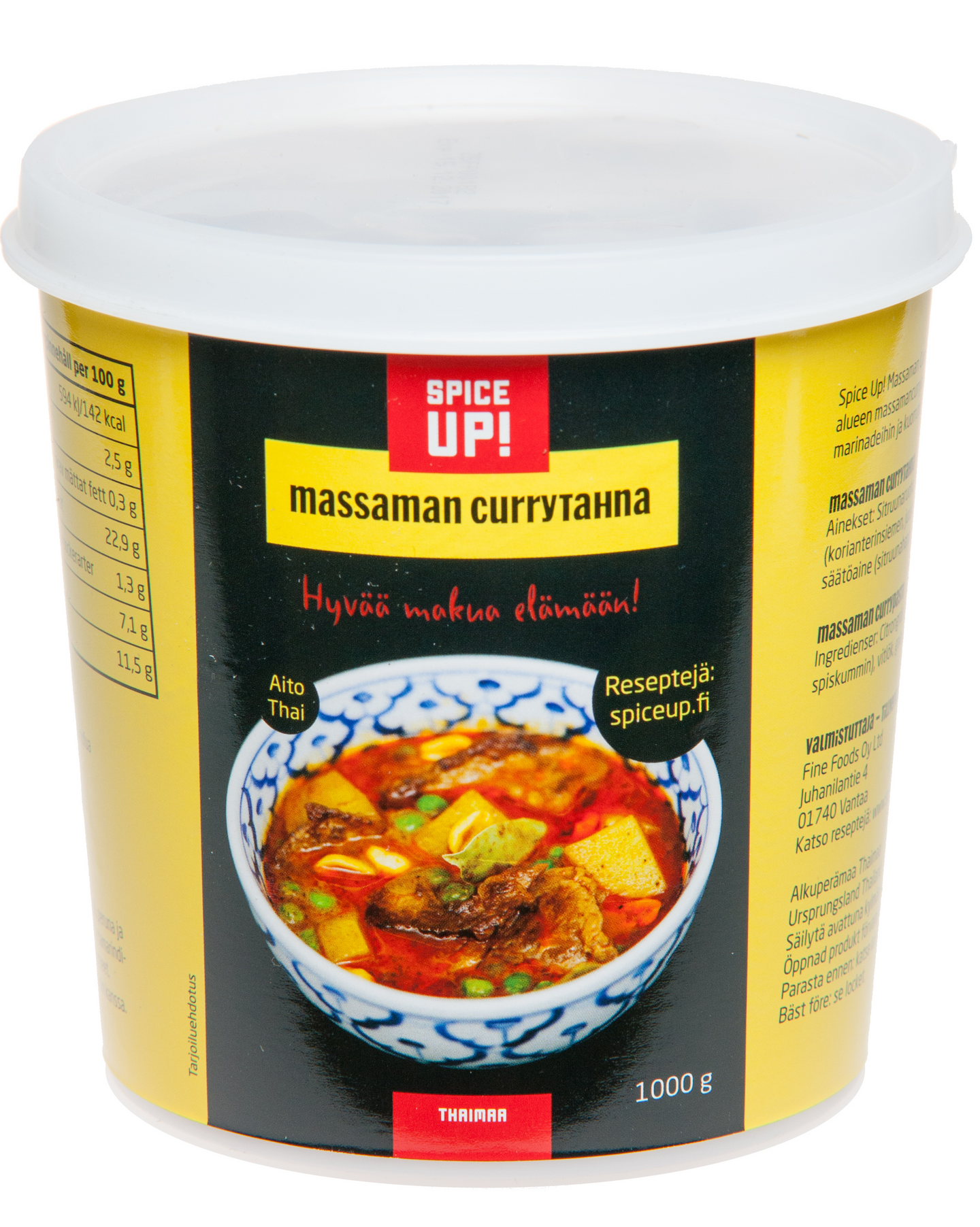 VegaaninenSpice Up! Massaman Currytahnalla valmistat aitoa Etelä-Thaimaan alueen täyteläistä massamancurrya. Perinteisesti massamancurry valmistetaan naudanlihasta, siihen sopii mainiosti myös ankka, porsas, kana tai tofu. Massaman curryyn kuuluu olennaisena osana myös peruna ja tamarinditahna. Massamanissa maistuu intialainen vivahde, joka syntyy tahnassa käytetyistä intialaisista kuivamausteista: korianterinsiemenestä ja juustokuminasta. Tahna on keskitulinen.