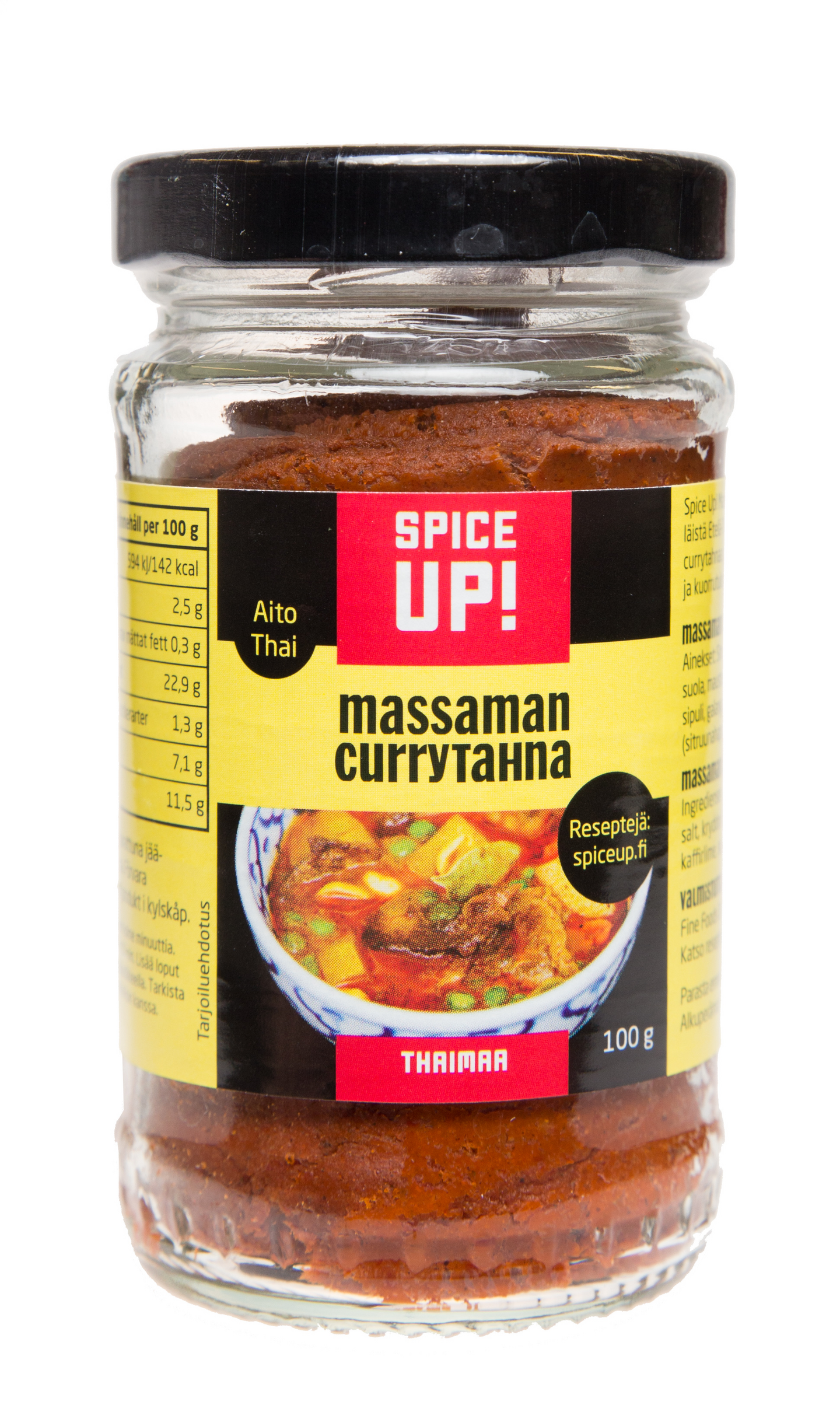 VegaaninenSpice Up! Massaman Currytahnalla valmistat aitoa Etelä-Thaimaan alueen täyteläistä massamancurrya. Perinteisesti massamancurry valmistetaan naudanlihasta, siihen sopii mainiosti myös ankka, porsas, kana tai tofu. Massaman curryyn kuuluu olennaisena osana myös peruna ja tamarinditahna. Massamanissa maistuu intialainen vivahde, joka syntyy tahnassa käytetyistä intialaisista kuivamausteista: korianterinsiemenestä ja juustokuminasta. Tahna on keskitulinen.